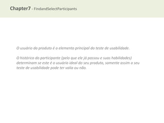 O documento discute o processo de seleção de participantes para testes de usabilidade, incluindo: