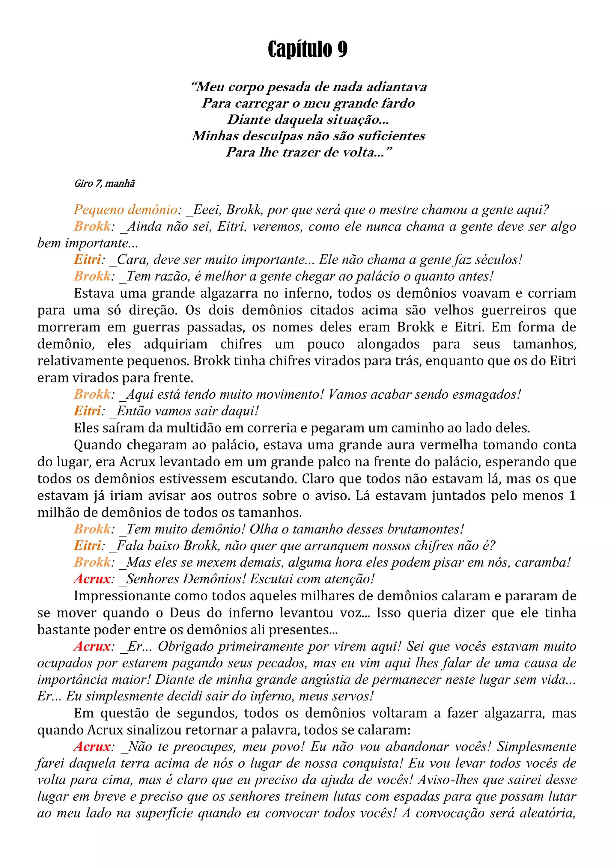 O capítulo resume uma reunião de demônios no inferno convocada por Acrux, deus do submundo, para anunciar seus planos de conquistar a terra. Ele pede aos demônios que treinem lutas com espadas para futuras batalhas. Na escola, o professor de história fala sobre os Esquadrões de Órion, guerreiros protegidos por deuses. Lucas treina luta corporal com Adara e ajuda Diphrá a limpar o pátio da escola.