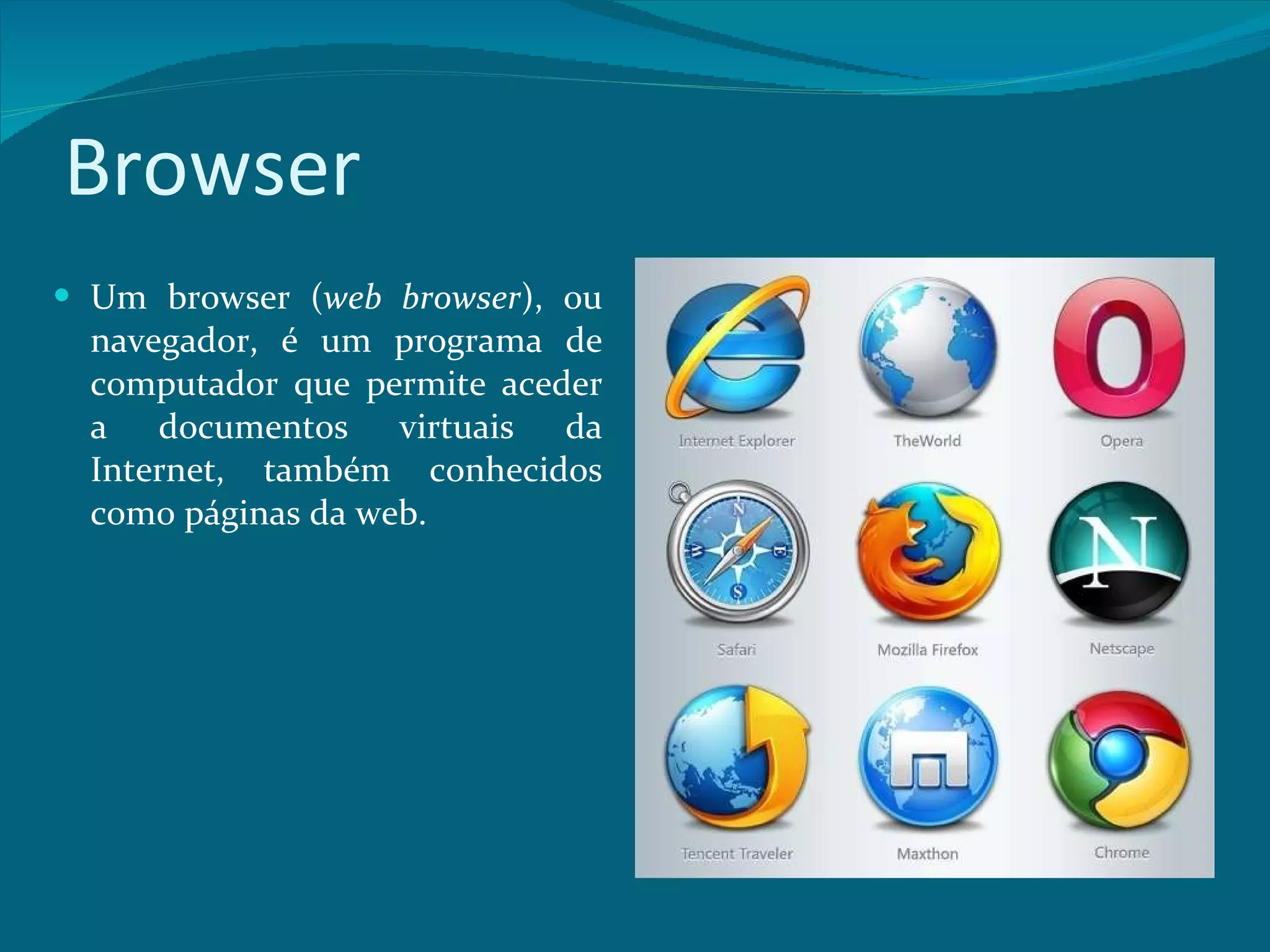 O documento descreve os principais serviços disponíveis na internet, incluindo browsers, motores de busca, e-mail, fóruns, IRC, FTP e a World Wide Web. Também fornece detalhes sobre termos comuns relacionados à internet como URLs, websites e ferramentas do Internet Explorer.