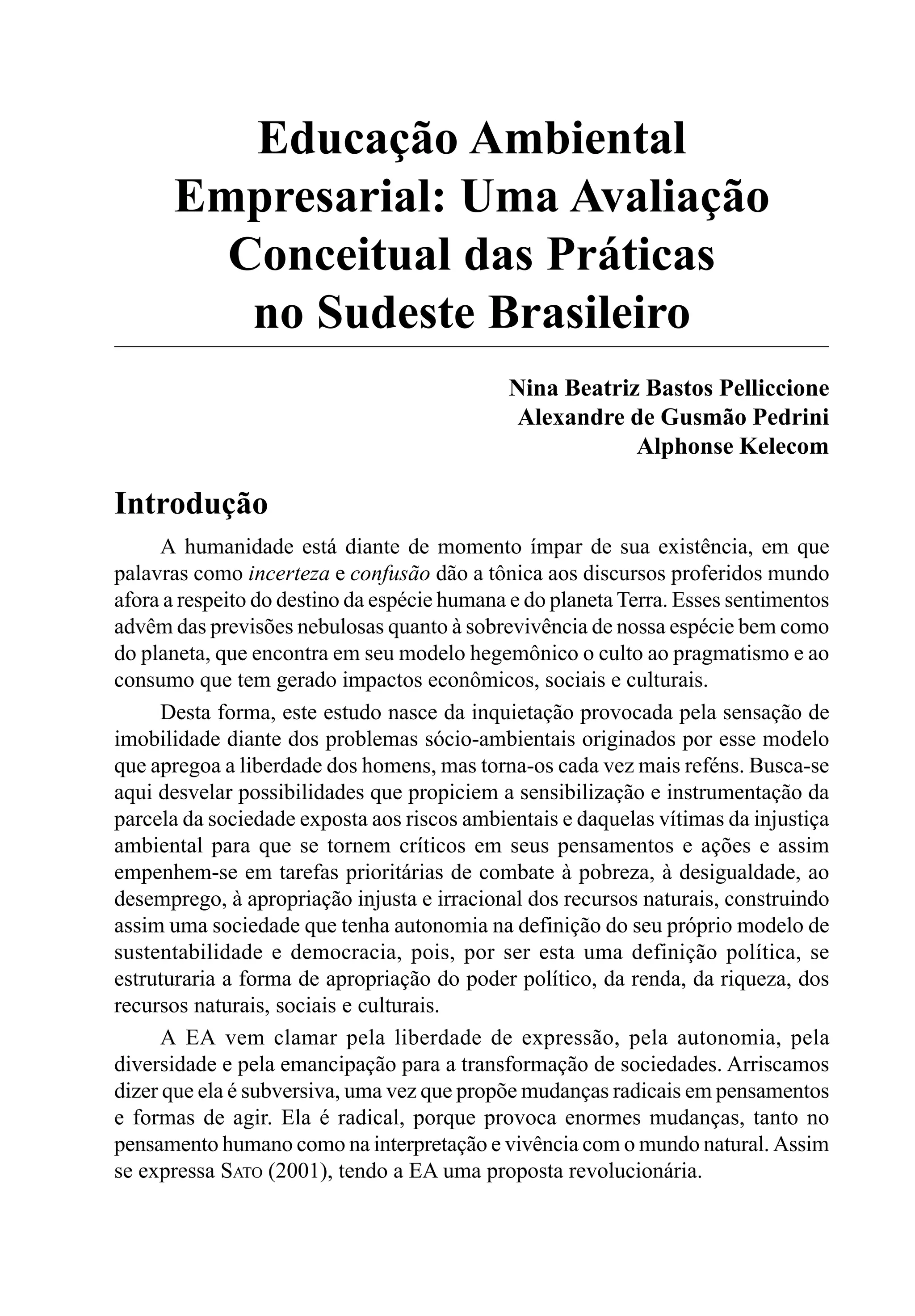 Este documento apresenta uma avaliação conceitual das práticas de educação ambiental empresarial no sudeste do Brasil, tendo como objetivo principal analisar se essas práticas estão de acordo com o conceito de educação ambiental para sociedades sustentáveis preconizado pelo Programa Nacional de Educação Ambiental brasileiro. O método utilizado foi o envio de questionários para empresas certificadas pela norma ISO 14001 na região, tendo obtido respostas de 29 empresas.