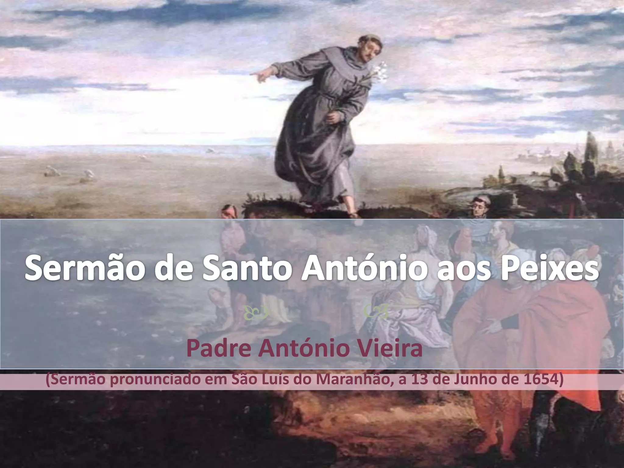 Padre António Vieira pronuncia um sermão em São Luís do Maranhão em 1654. Ele elogia os peixes por louvarem a Deus com sua existência, apesar de sua irracionalidade, e pede aos ouvintes que também louvem a Deus.