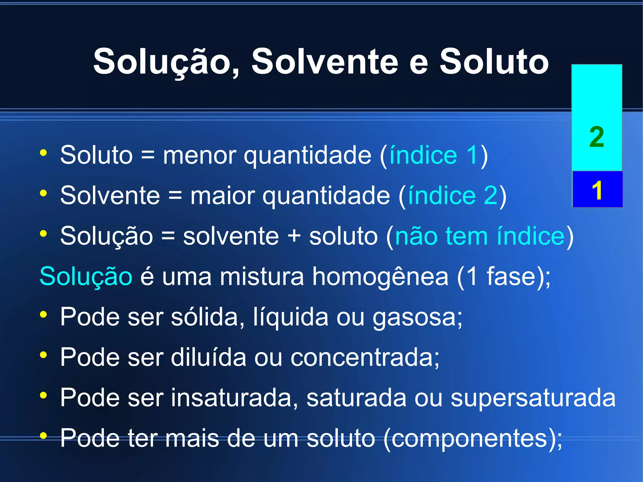 O documento descreve os principais conceitos relacionados a soluções, incluindo: 1) o soluto é a menor quantidade, o solvente a maior quantidade e a solução é a mistura dos dois; 2) as soluções podem ser sólidas, líquidas ou gasosas; 3) preparar soluções envolve medir a massa do soluto e completar o volume com o solvente.