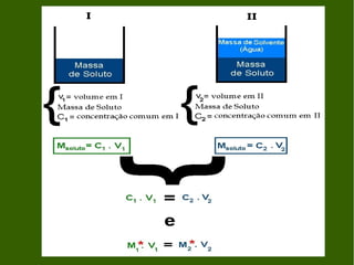 1) O documento descreve processos de diluição de soluções e mistura de soluções, incluindo cálculos de concentração final.