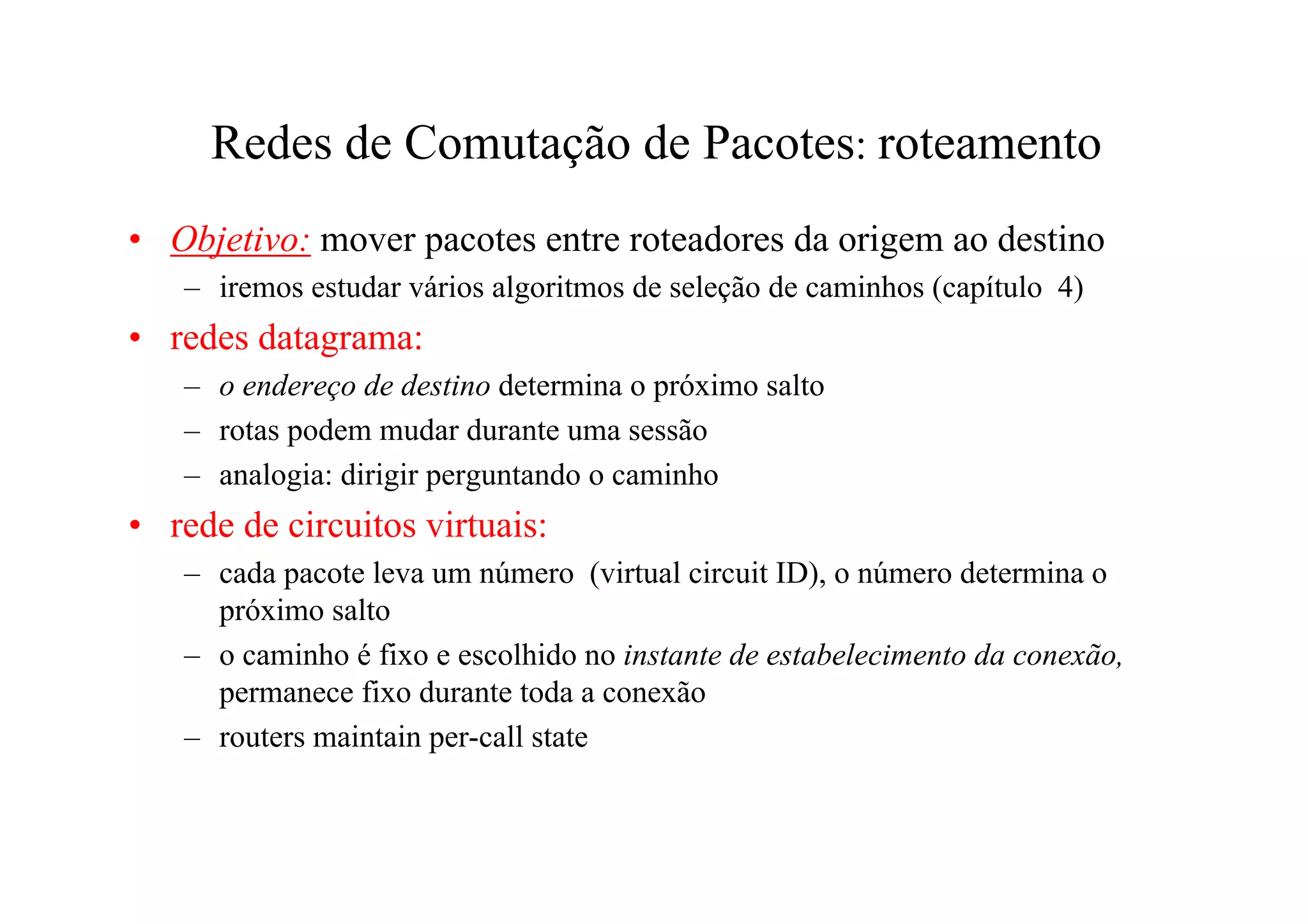 O documento discute as diferenças entre comutação de pacotes e comutação de circuitos, e como as redes de comutação de pacotes roteiam pacotes entre roteadores. Também aborda como os sistemas finais se conectam aos roteadores de borda através de redes de acesso, e os diferentes meios físicos e protocolos de camadas usados para implementar redes de computadores.
