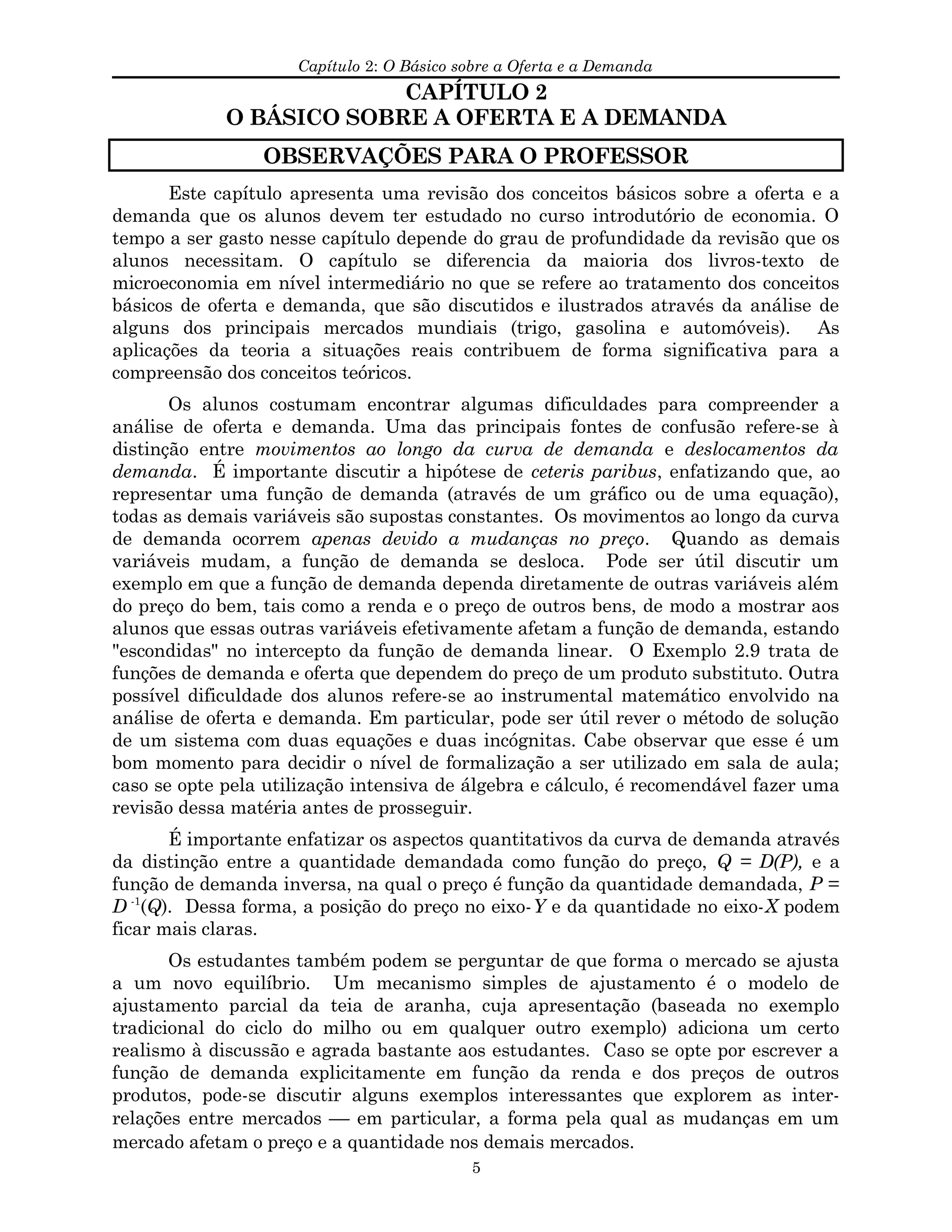 Este capítulo apresenta os conceitos básicos de oferta e demanda, ilustrados por análises de mercados reais como trigo, gasolina e automóveis. Discute dificuldades comuns dos alunos como a distinção entre movimentos ao longo da curva de demanda e deslocamentos, e sugere abordagens para superá-las.