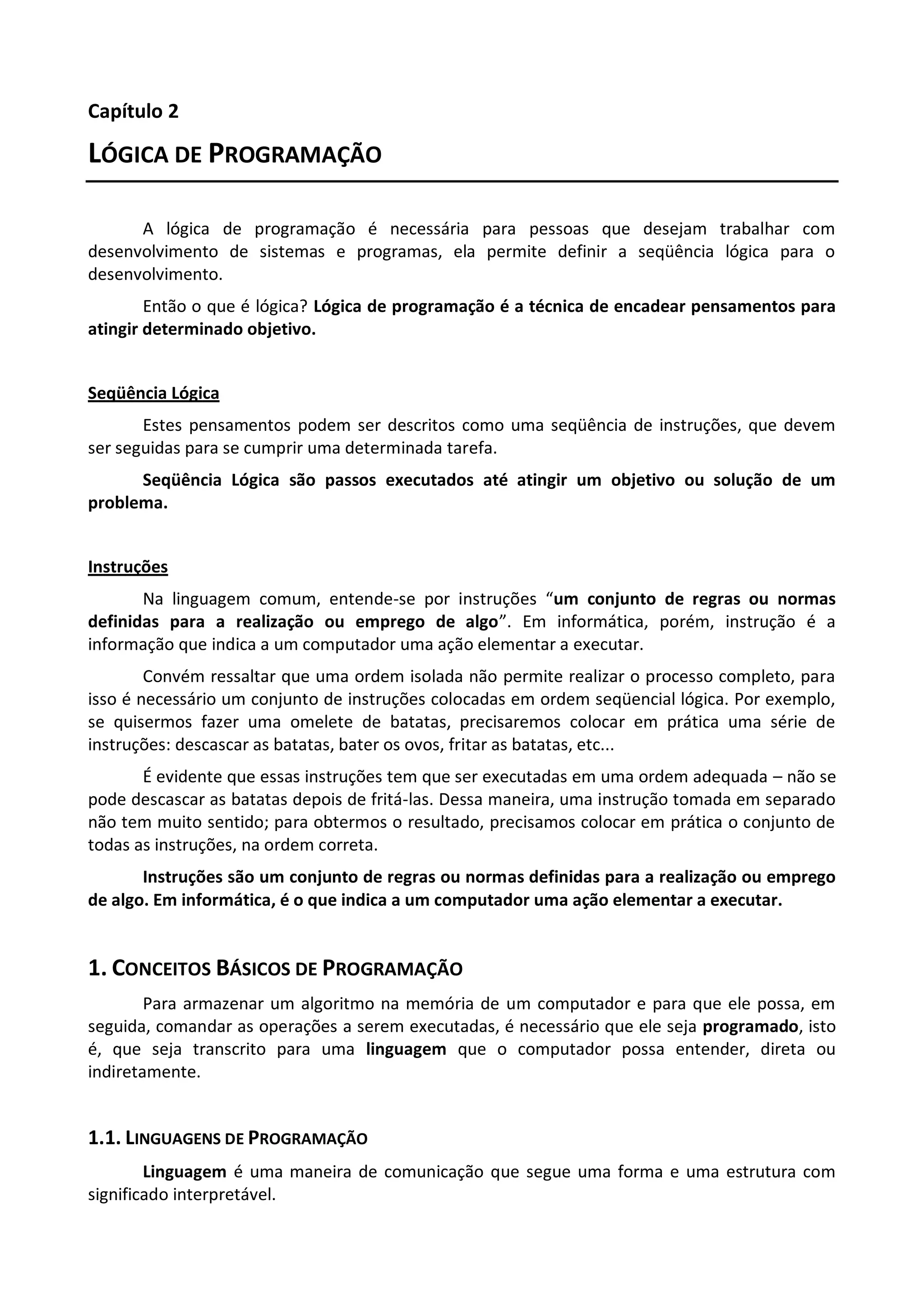 1) A lógica de programação é necessária para desenvolvimento de sistemas e permite definir a sequência lógica para o desenvolvimento de programas. 2) Lógica de programação é a técnica de encadear pensamentos lógicos em uma sequência de instruções para atingir um objetivo. 3) Instruções são regras ou normas definidas para realizar uma tarefa no computador, indicando ações elementares a serem executadas.