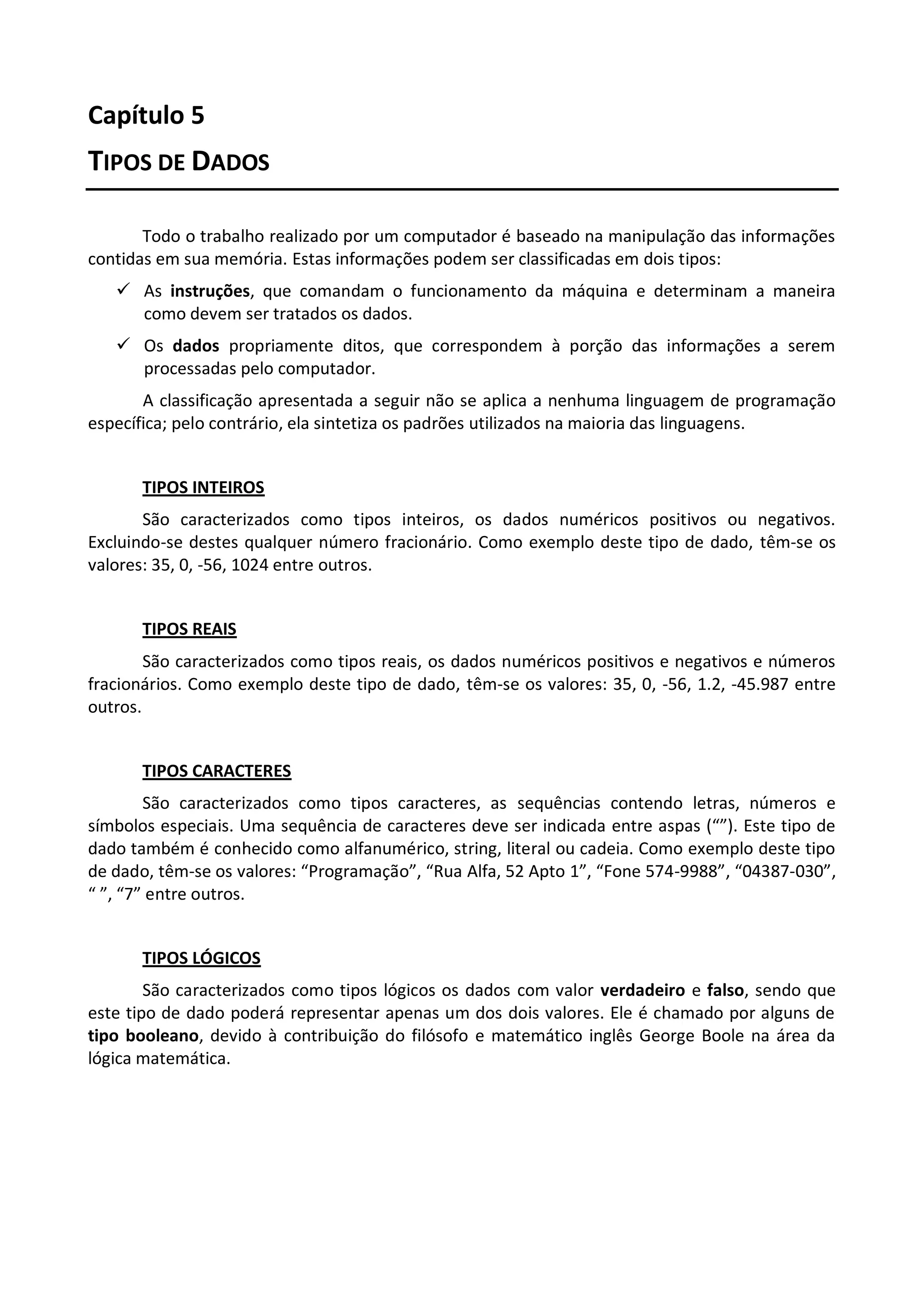 O documento discute os tipos de dados em programação, incluindo inteiros, reais, caracteres e lógicos. Variáveis armazenam dados na memória e precisam ser definidas antes do uso, incluindo nome, tipo e valor. Constantes são valores fixos também definidos no início do programa.