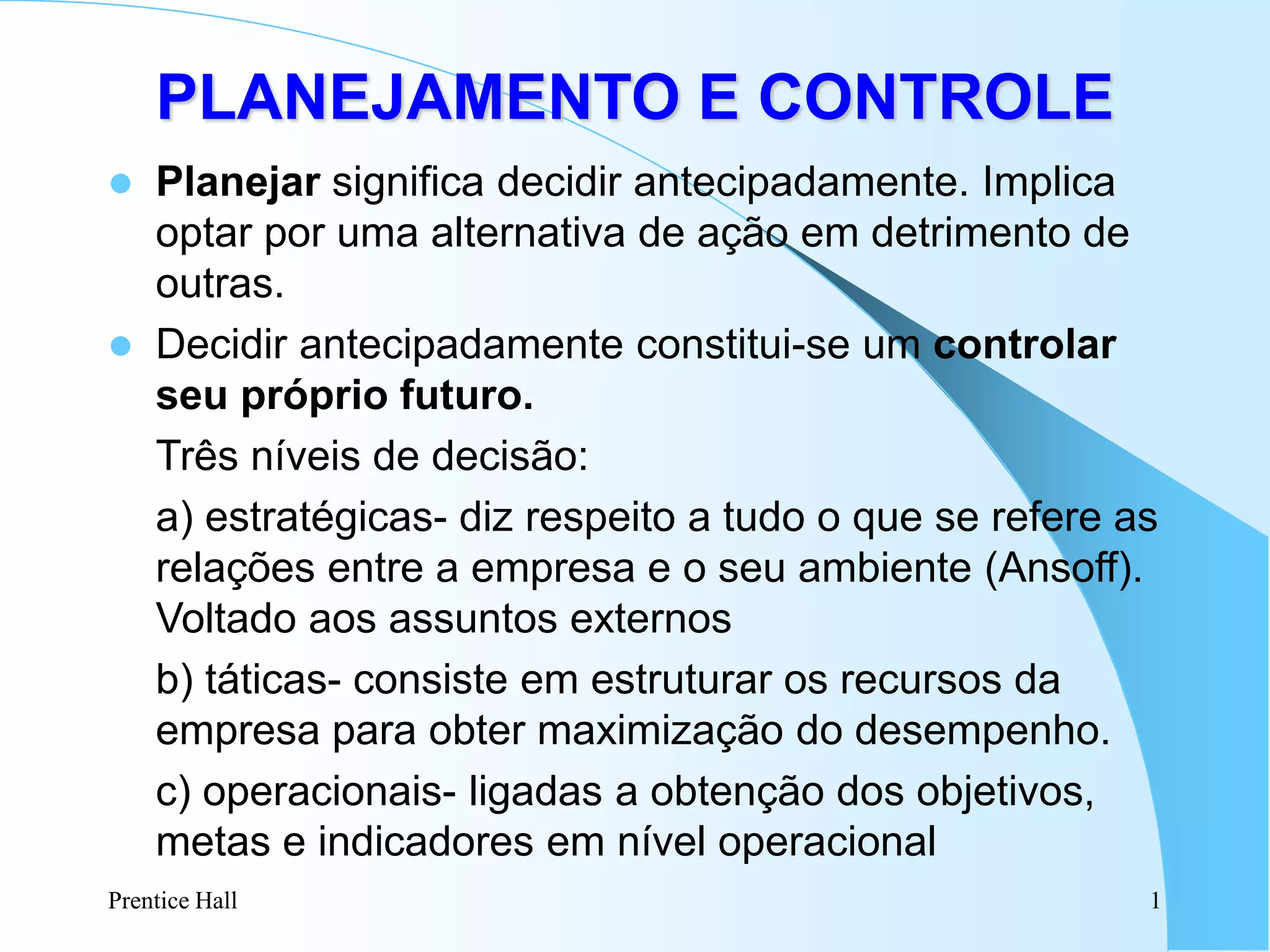 O documento discute os conceitos e etapas do planejamento empresarial e financeiro. Ele explica que o planejamento envolve três níveis de decisão - estratégico, tático e operacional - e descreve as etapas do planejamento financeiro, incluindo a elaboração de planos de vendas, produção, compras, recursos humanos, investimentos e gastos.