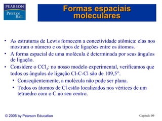 Este documento resume os principais conceitos de geometria molecular e teoria de ligação. [1] Discute as formas espaciais moleculares determinadas pelos ângulos de ligação e a teoria de repulsão de pares de elétrons de valência. [2] Explica como a hibridização de orbitais atômicos em orbitais híbridos sp, sp2 e sp3 permite explicar as geometrias observadas. [3] Descreve como a polaridade molecular depende da geometria e da diferença de eletronegatividade entre os á
