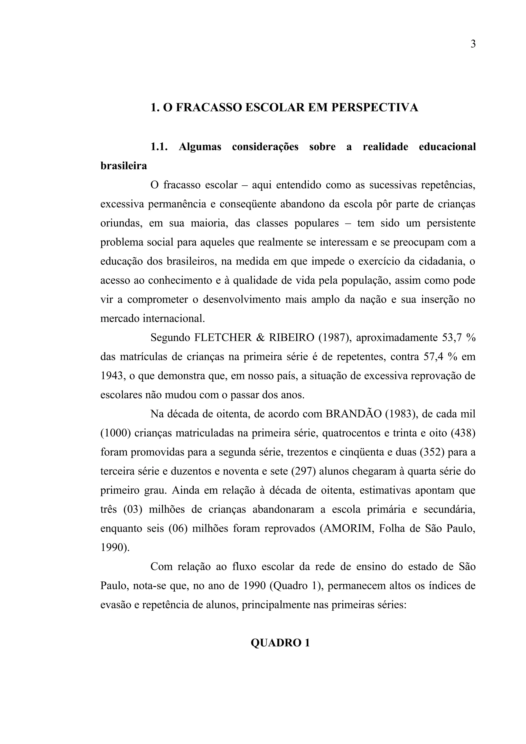 1) O fracasso escolar no Brasil é um problema social persistente, com altas taxas de repetência e evasão escolar. 2) As teorias sobre as causas do fracasso escolar incluem a privação cultural, que atribui as dificuldades dos alunos pobres a falta de estímulos nos primeiros anos de vida. 3) Outras teorias apontam que as diferenças entre o código linguístico da escola e das classes populares dificultam o aprendizado dessas crianças.
