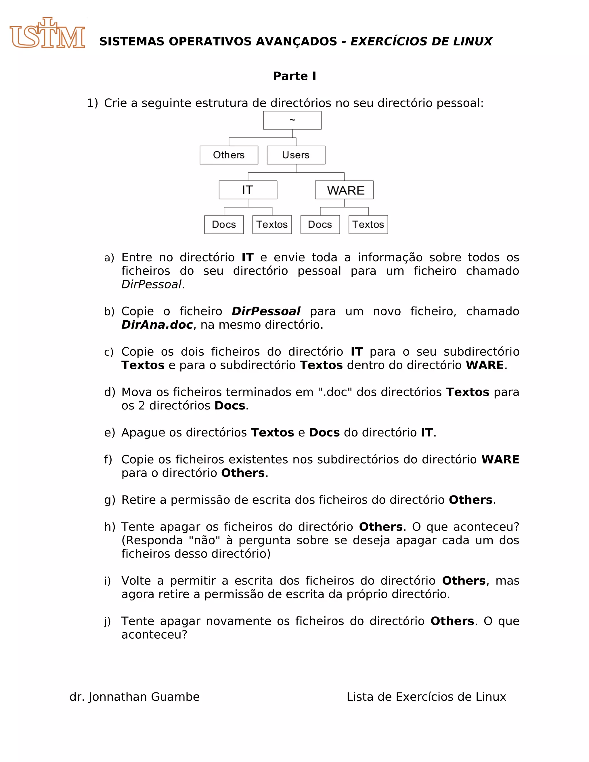 Este documento fornece uma lista de exercícios em Linux divididos em duas partes. A primeira parte inclui exercícios para criar e manipular diretórios e arquivos, mover e copiar arquivos entre diretórios. A segunda parte inclui exercícios para pesquisar arquivos, medir tempo de pesquisa e criar um script shell para copiar arquivos e mostrar informações sobre eles.