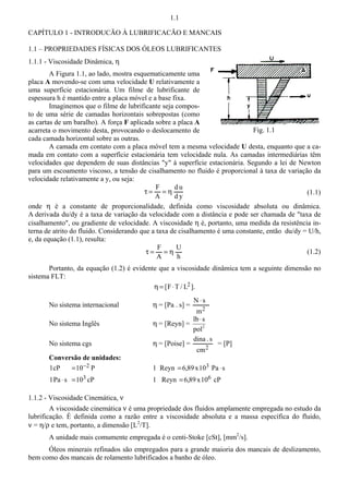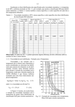 1. O documento discute propriedades físicas de óleos lubrificantes como viscosidade dinâmica e cinemática e como elas variam com a temperatura. 2. É apresentada a classificação ISO de óleos lubrificantes com suas viscosidades correspondentes. 3. São descritos os três regimes de lubrificação - película fluida, película mista e lubrificação-limite - e como a espessura da película de óleo depende de fatores como viscosidade, velocidade e carga.