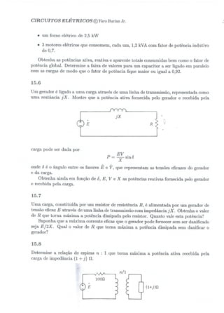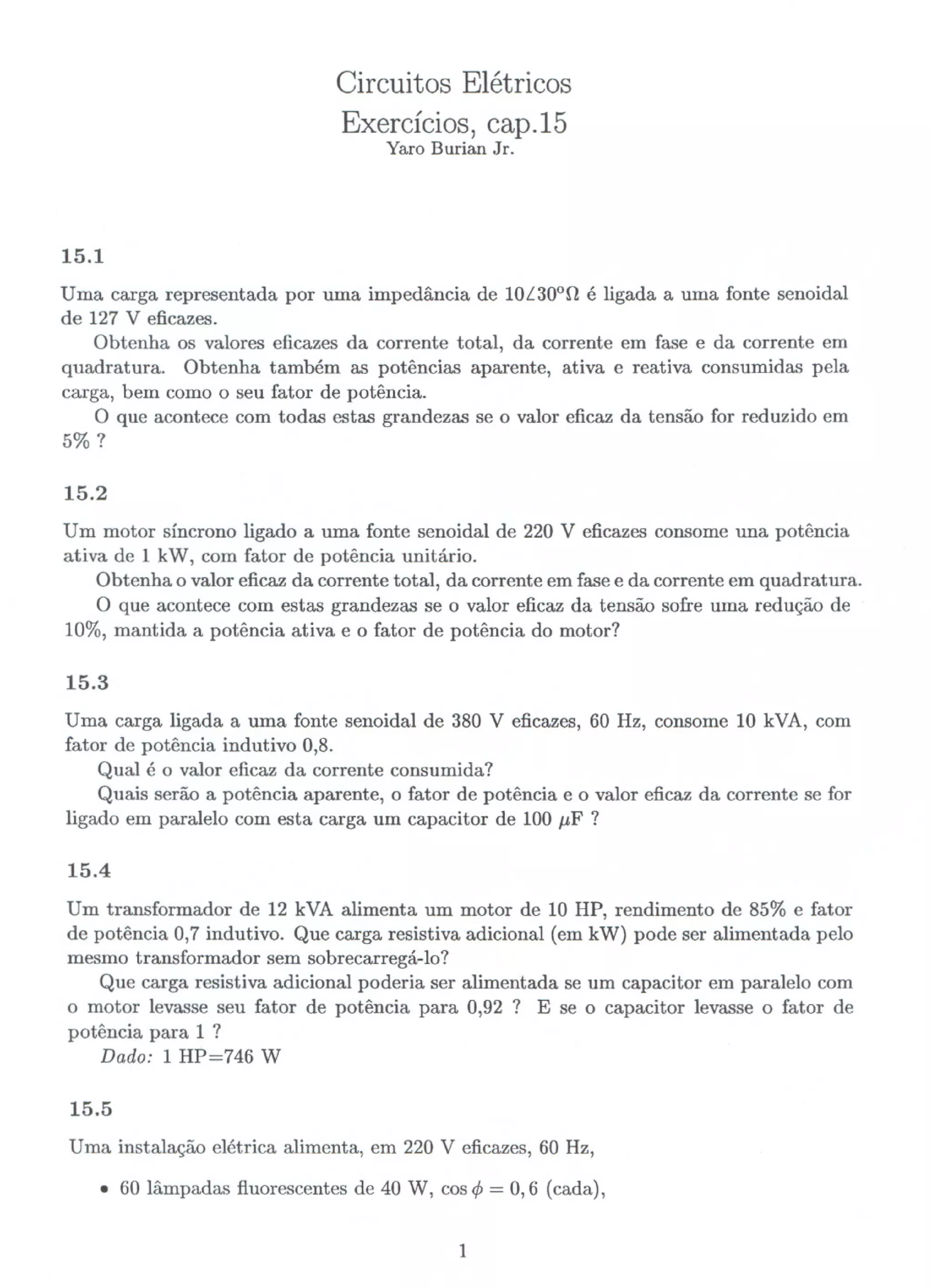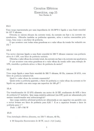 Este documento contém 16 exercícios sobre circuitos elétricos trifásicos e cargas monofásicas. Os exercícios abordam cálculos de corrente, potência ativa, reativa e aparente para diferentes configurações de circuitos e variações de tensão e potência. Alguns exercícios tratam também de fator de potência e dimensionamento de capacitores para sua correção.
