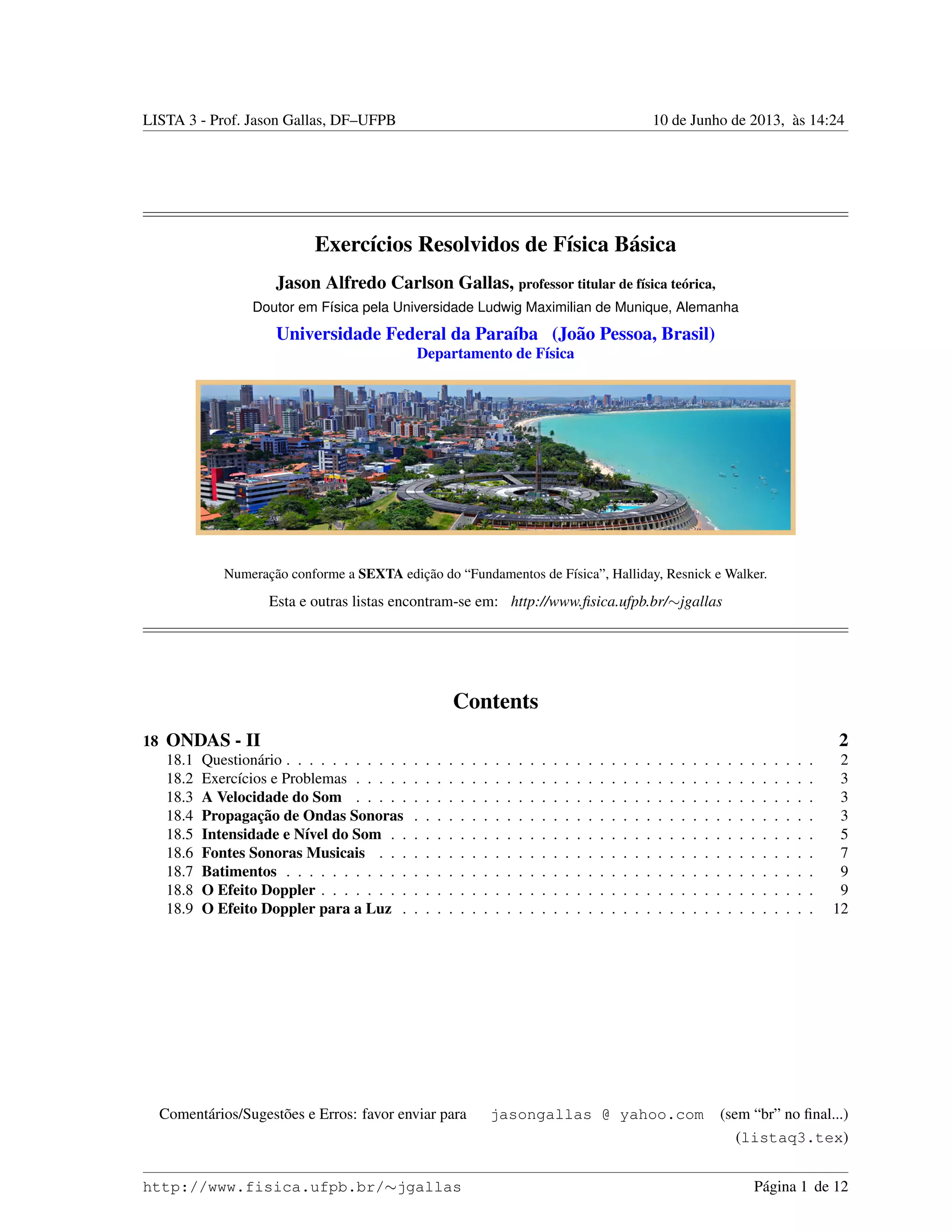 1) O documento é uma lista de exercícios resolvidos de física básica sobre ondas, preparada por um professor de física teórica da UFPB.