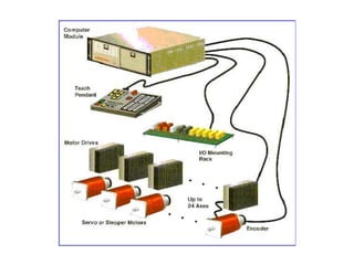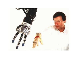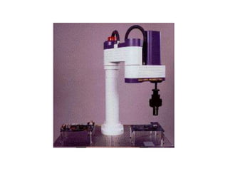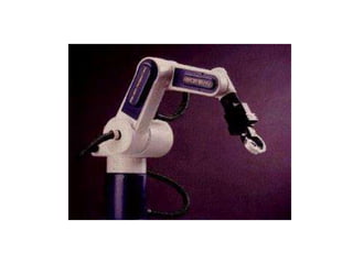 O documento introduz os conceitos básicos de robótica, incluindo a definição de robô e espaço de trabalho. Também descreve os componentes principais de um robô manipulador industrial, como o braço, punho e órgão terminal, além de discutir os diferentes tipos de mecanismos de braço e a programação de tarefas.