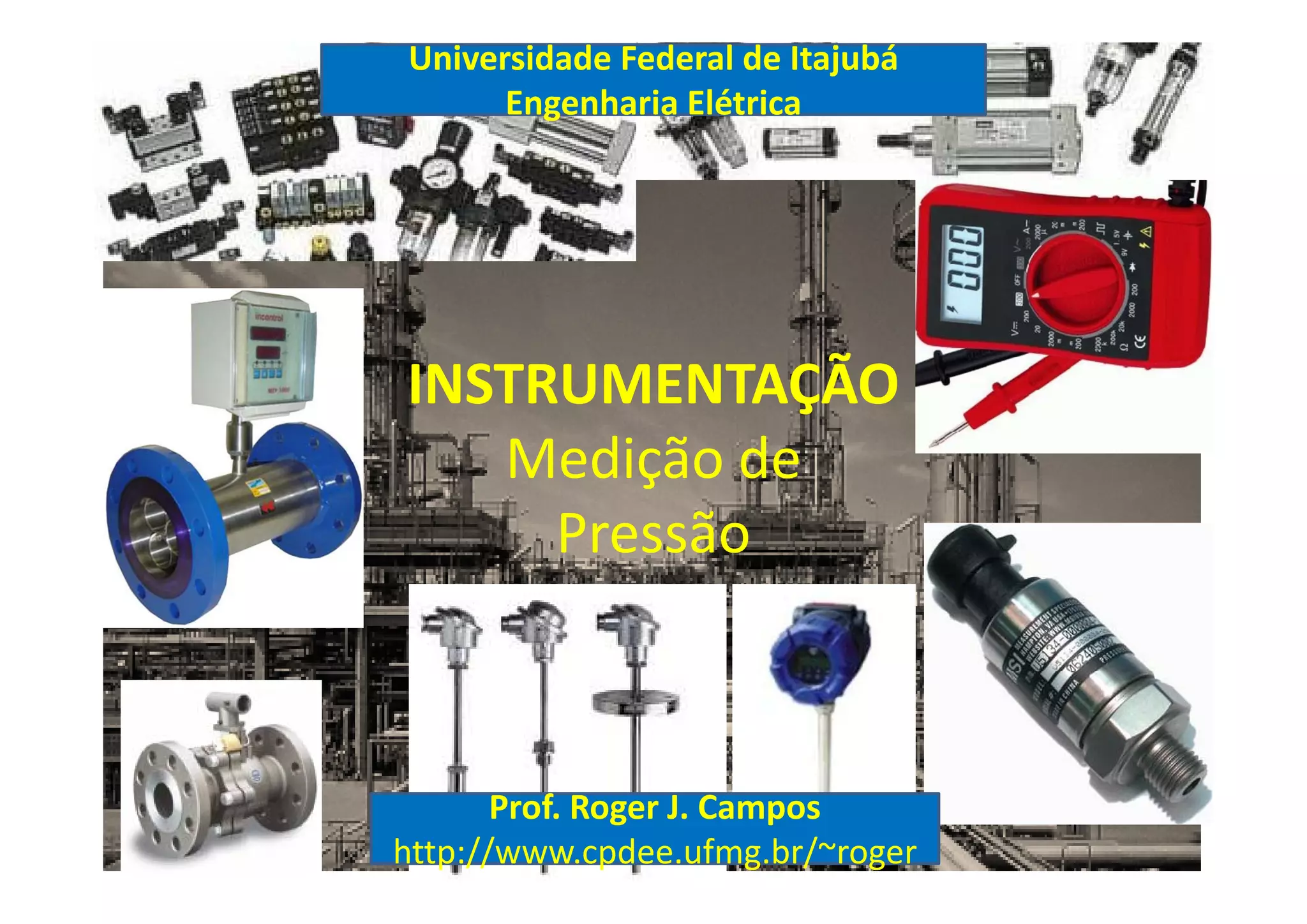 O documento descreve diferentes métodos e dispositivos para medição de pressão. Ele discute conceitos básicos de pressão e unidades de medida, e apresenta exemplos de aplicações de medição de pressão. O documento também descreve diversos tipos de manômetros e dispositivos para medição de pressão, incluindo manômetros de coluna líquida, barômetros, manômetros por deformação mecânica, e manômetros eletrônicos baseados em capacitância, piezoresistividade, piezoelectricidade e relutância variável.