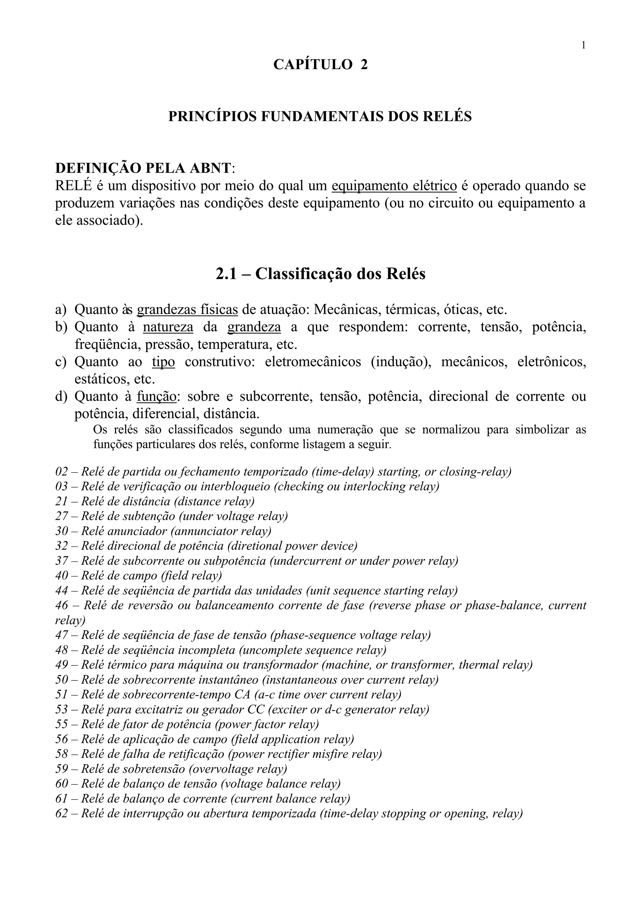 1) O documento descreve os principais tipos e classificações de relés, dispositivos elétricos que operam circuitos quando há variações nas condições do equipamento ou circuito associado.