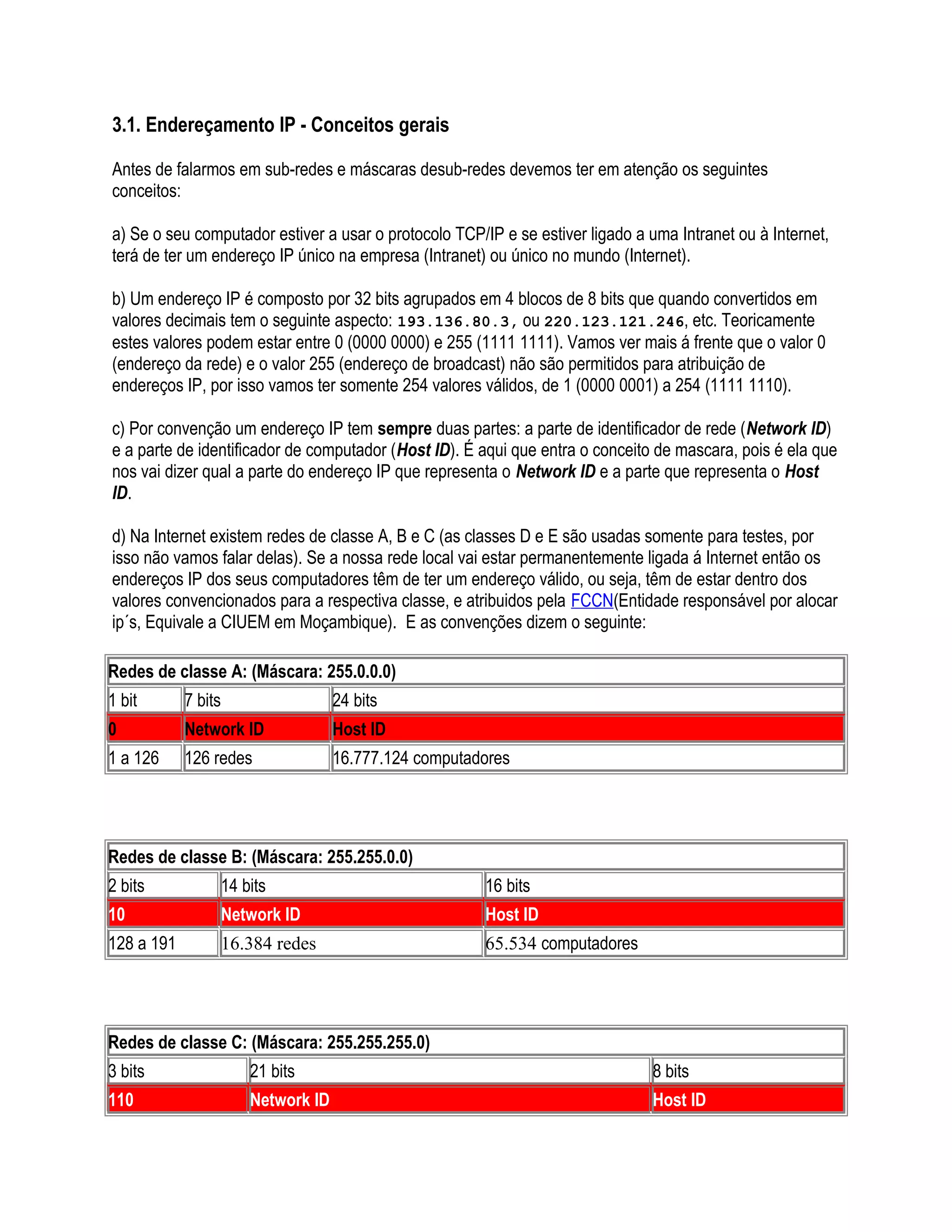 O documento discute conceitos fundamentais de endereçamento IP, incluindo como endereços IP são compostos e atribuídos, o conceito de máscara de sub-rede para distinguir entre identificadores de rede e de host, e como a técnica de subdivisão de redes ("subnetting") permite dividir uma rede lógica em várias sub-redes físicas.