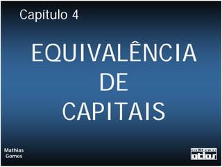 O documento apresenta um exemplo resolvido de equivalência de capitais utilizando equações de valor. Nele, são comparados os valores atuais de diferentes aplicações financeiras considerando taxas de juros compostas.