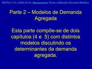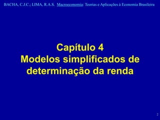 O documento descreve modelos macroeconômicos simplificados de determinação da renda. Estes modelos assumem que o consumo depende da renda disponível e que o investimento é exógeno. O primeiro modelo apresentado supõe que o consumo é uma função linear da renda disponível.