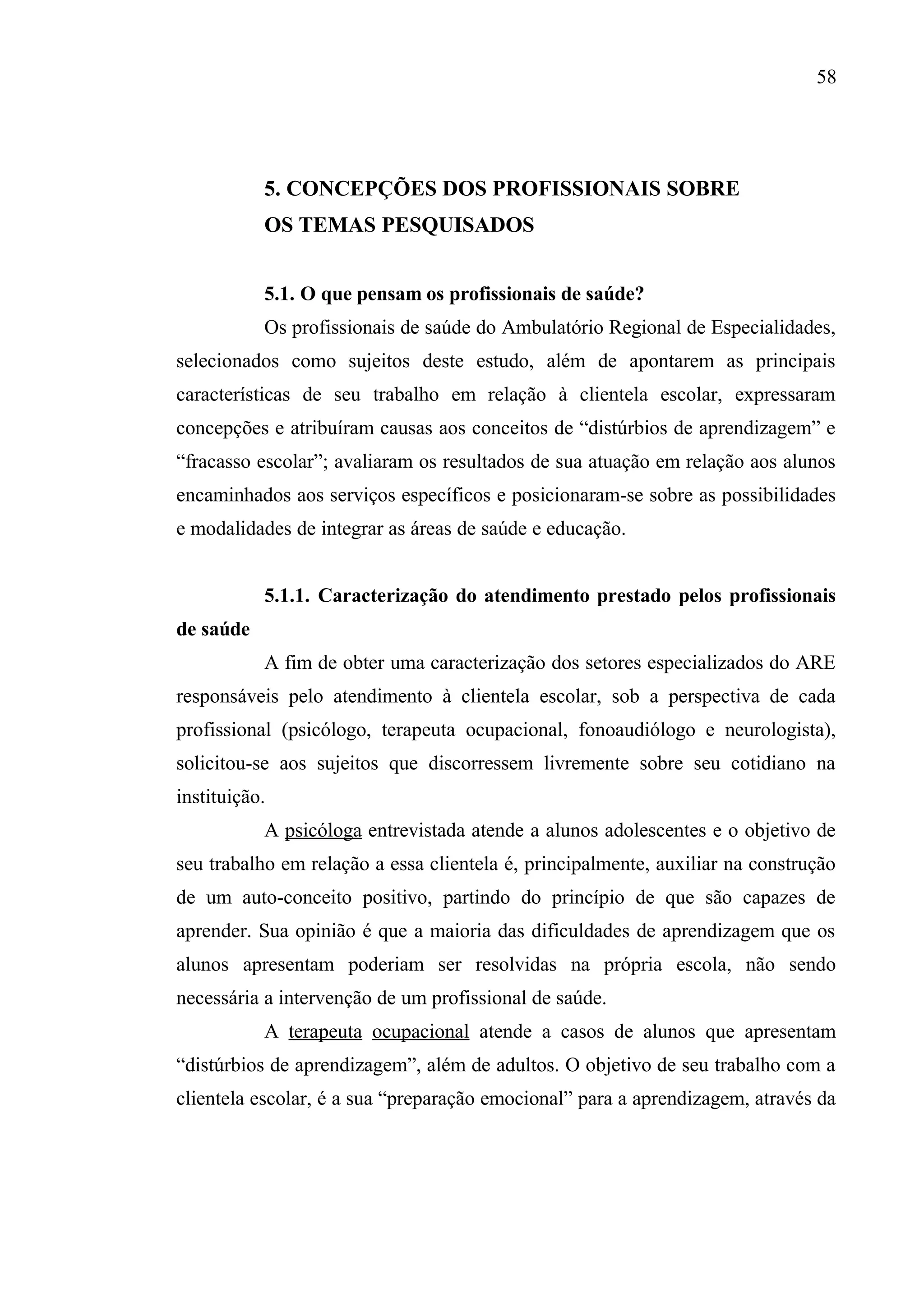 1) Os profissionais de saúde discutem suas perspectivas sobre distúrbios de aprendizagem e fracasso escolar.