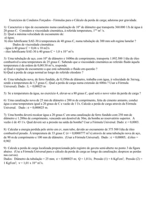 1) O documento apresenta 37 exercícios sobre hidráulica de tubulações, incluindo cálculos de vazão, velocidade, perda de carga e pressão para diversos tipos de tubulações transportando água e óleo.