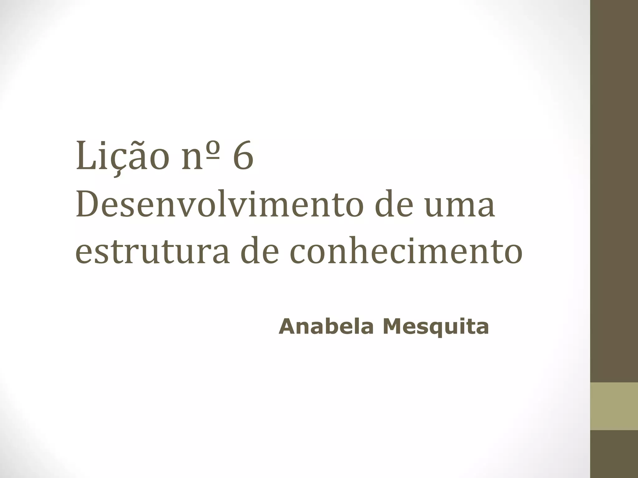 Este documento resume as três fases do desenvolvimento de uma estrutura de conhecimento em uma organização: 1) clarificar o escopo do conhecimento nuclear, 2) definir os parâmetros do conhecimento nuclear, e 3) desenvolver a estrutura do conhecimento nuclear. Apresenta os objetivos e etapas de cada fase para mapear, categorizar e construir um repositório do conhecimento essencial de uma organização.