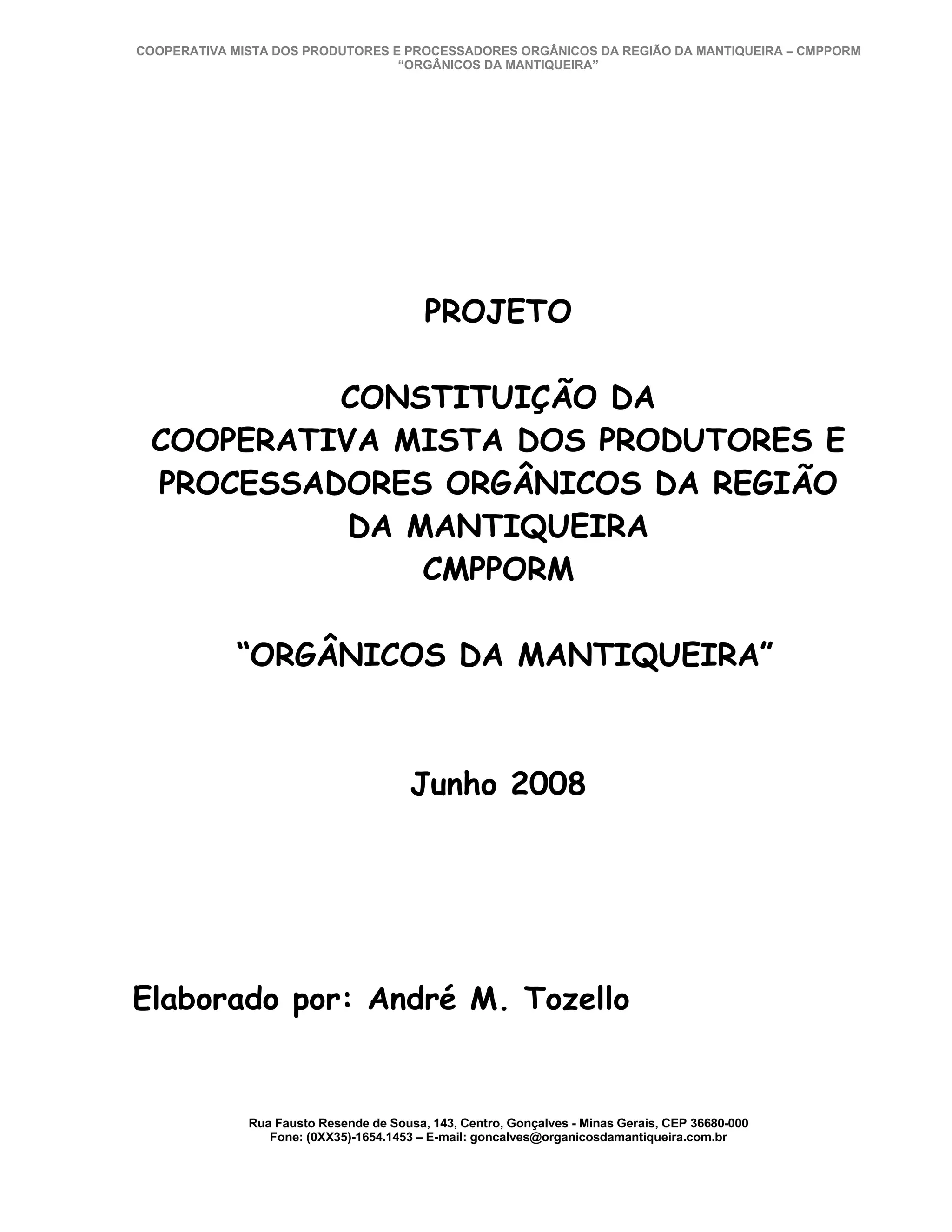 Este documento propõe a criação da Cooperativa Mista dos Produtores e Processadores Orgânicos da Região da Mantiqueira (CMPPORM) para apoiar produtores e processadores orgânicos na região da Mantiqueira em Minas Gerais.