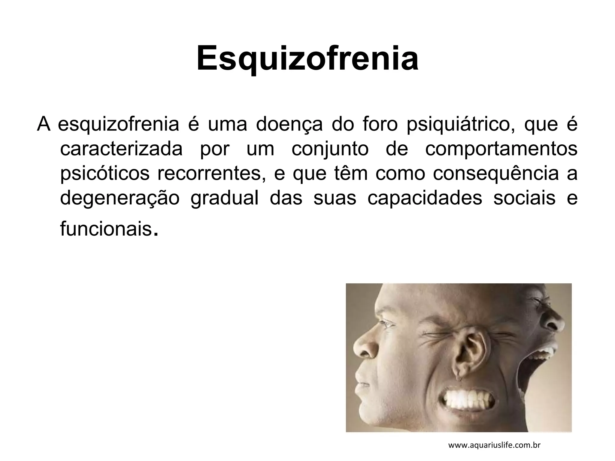 A esquizofrenia é uma doença psiquiátrica caracterizada por comportamentos psicóticos recorrentes que causam degeneração das capacidades sociais e funcionais. Ela afeta homens e mulheres e geralmente começa na adolescência ou início da idade adulta, podendo ter vários tipos com diferentes sintomas. Não há uma causa única conhecida, mas fatores biológicos, genéticos e ambientais contribuem para seu desenvolvimento.