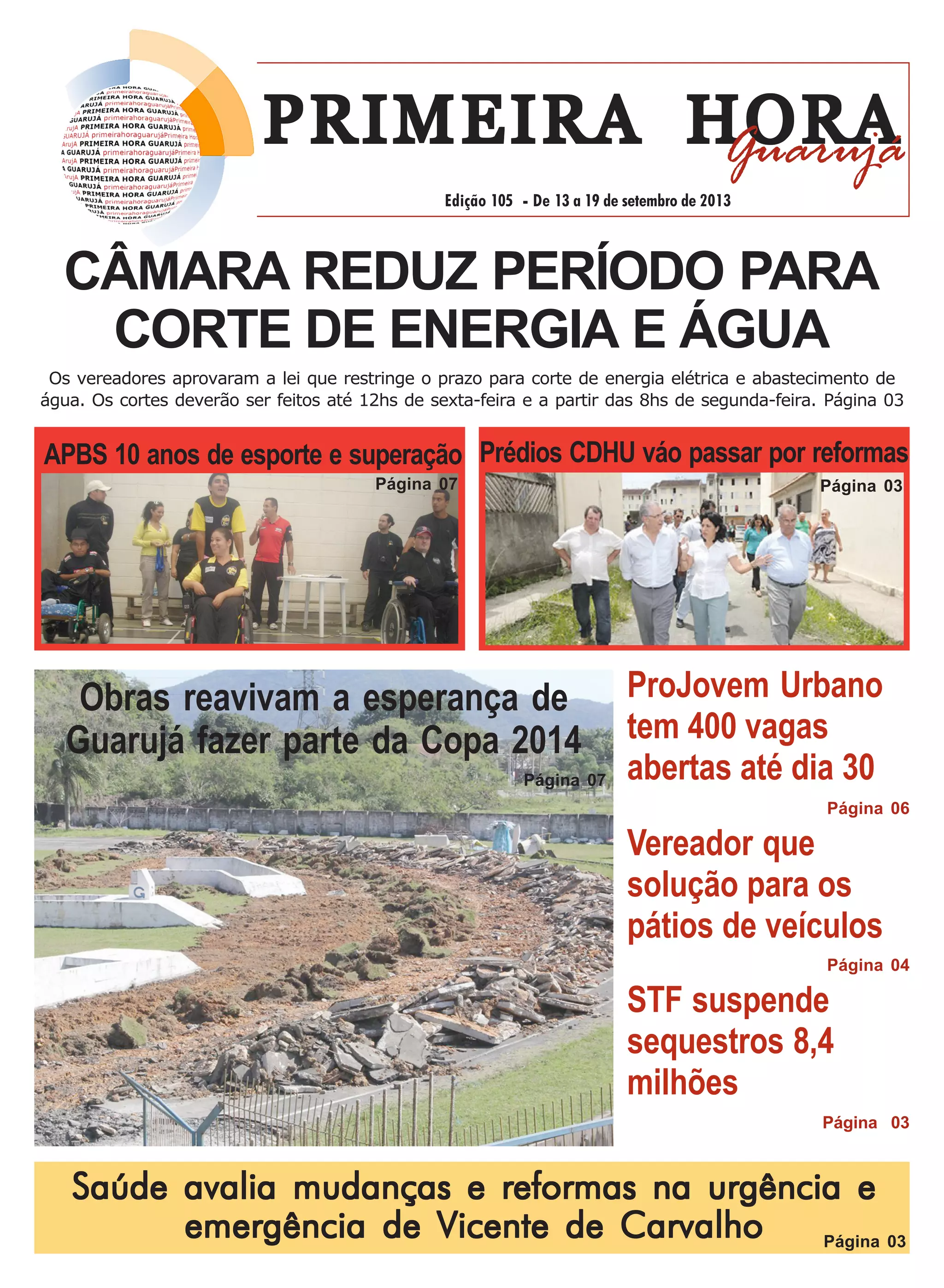 A Câmara aprovou uma lei que restringe o período para corte de energia elétrica e abastecimento de água, limitando os cortes até as 12h de sexta-feira e a partir das 8h de segunda-feira. O Departamento de Saúde avalia mudanças e reformas na urgência e emergência do hospital de Vicente de Carvalho. Obras em Guarujá reacendem a esperança da cidade sediar eventos da Copa de 2014.