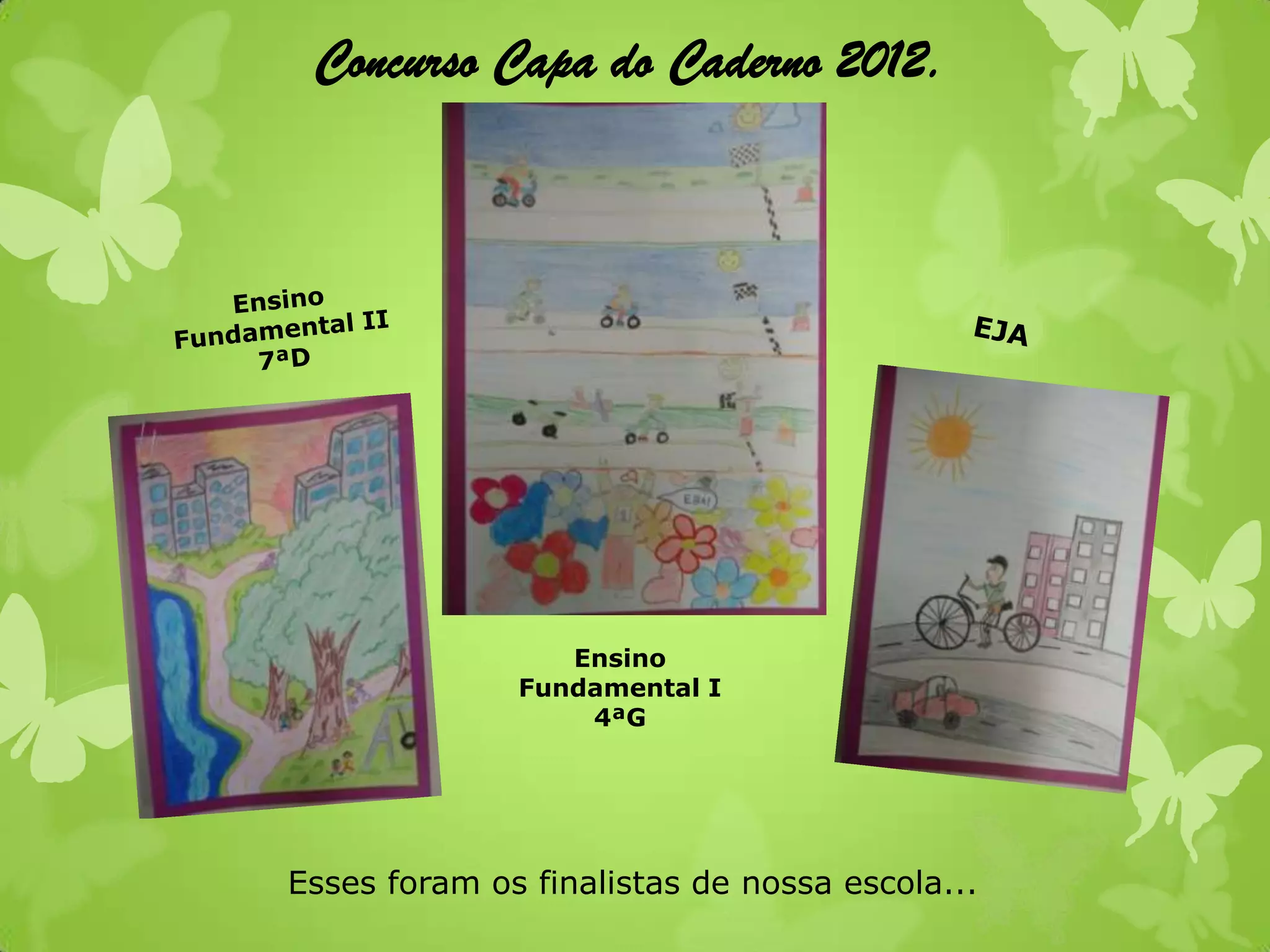 O documento descreve um concurso de criação de capas de caderno escolar, no qual alunos de diferentes séries participaram e enviaram trabalhos criativos. A aluna Larissa Ferreira da 4a série foi a grande vencedora da escola e teve seu trabalho selecionado para a Diretoria Regional de Ensino.