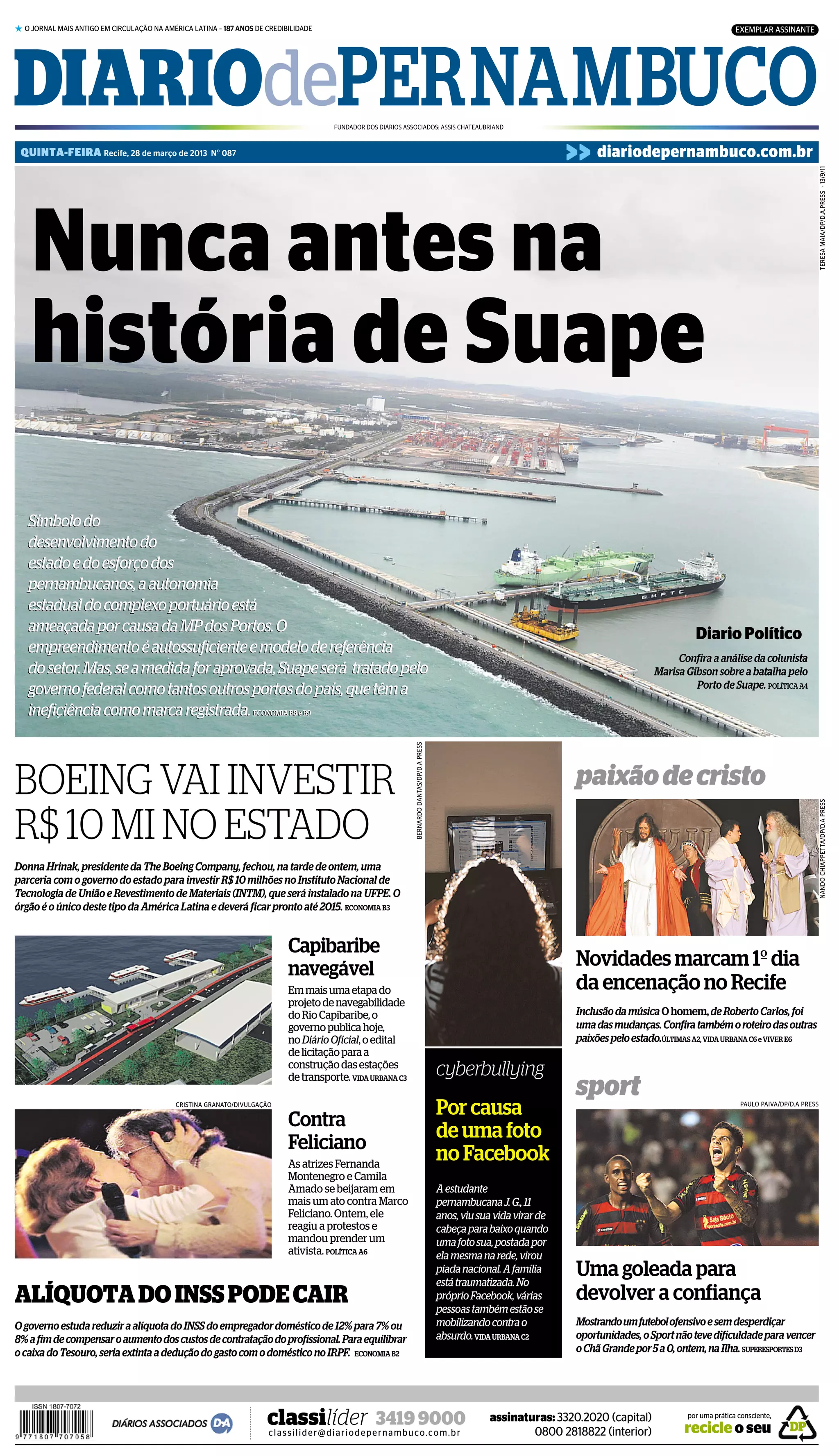 O documento discute três principais pontos: 1) A autonomia do Porto de Suape, símbolo do desenvolvimento de Pernambuco, está ameaçada pela MP dos Portos; 2) A Boeing vai investir R$ 10 milhões no INTM da UFPE; 3) Uma estudante pernambucana de 11 anos teve sua vida afetada por cyberbullying após foto no Facebook.