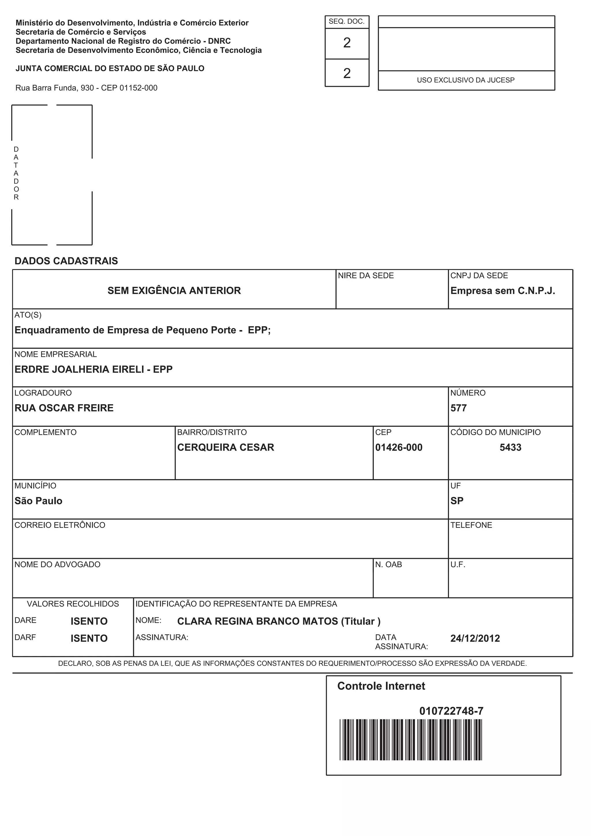 [1] O documento concede o enquadramento como Empresa de Pequeno Porte (EPP) para a ERDRE JOALHERIA EIRELI. [2] A empresa está localizada na Rua Oscar Freire, 577, Cerqueira Cesar, São Paulo. [3] Clara Regina Branco Matos é a titular da empresa.