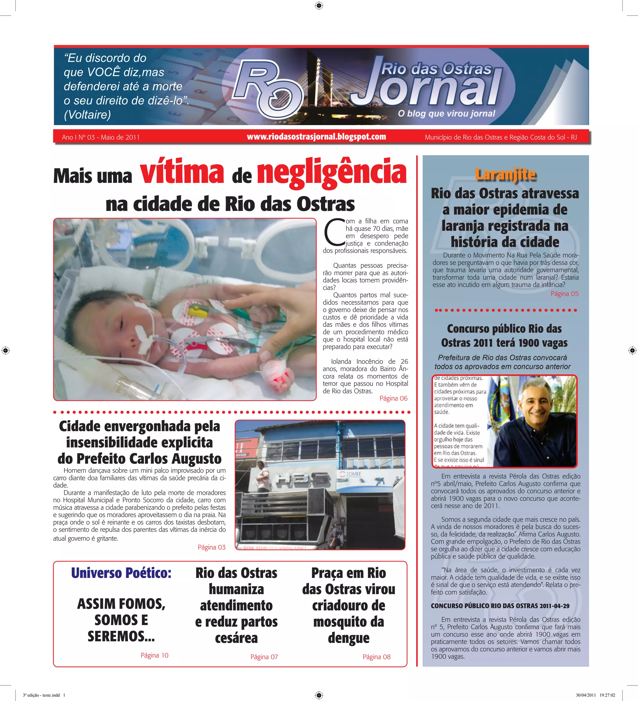 O documento relata vários problemas de saúde pública em Rio das Ostras, incluindo a morte de moradores no hospital municipal, um surto de dengue, e altas taxas de partos cesáreos. A população protesta contra a negligência do governo local, enquanto o prefeito Carlos Augusto defende investimentos na área da saúde e anuncia um novo concurso público com 1.900 vagas.