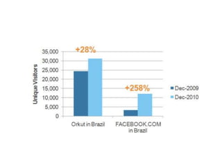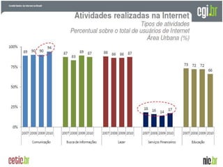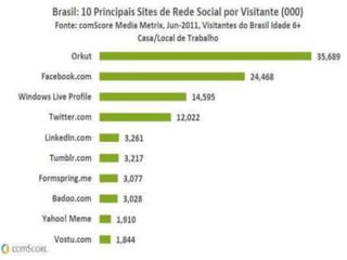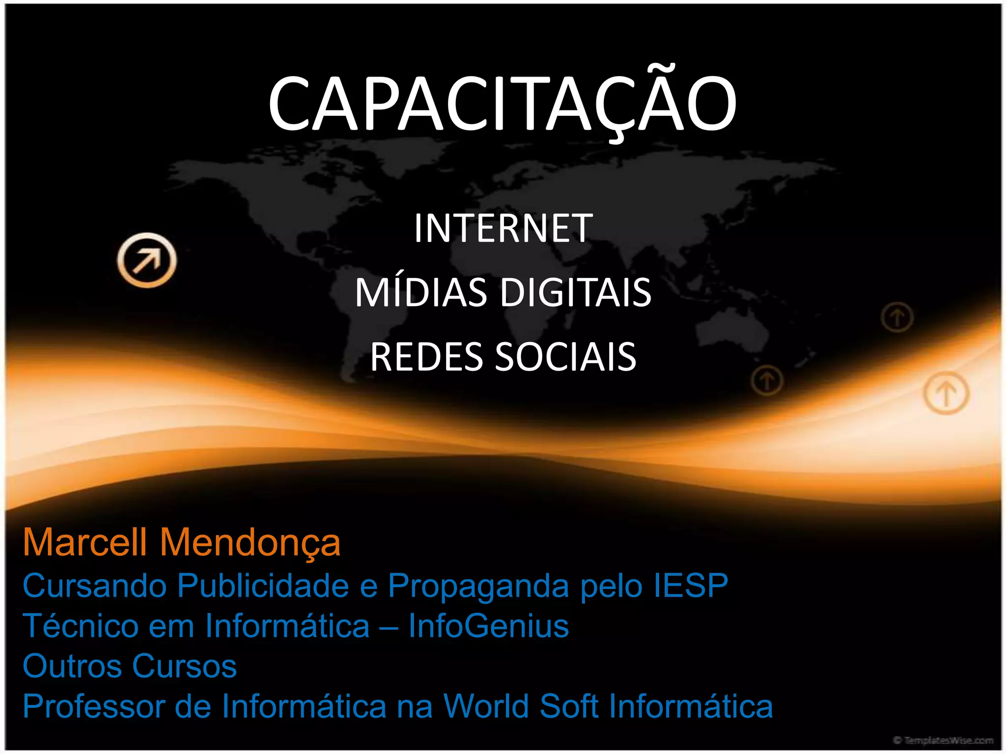 O documento discute capacitação em internet, mídias digitais e redes sociais. Ele define o que é a internet e como ela está estruturada, explica como se conectar à internet e os termos comuns na internet. Também discute o surgimento das mídias digitais, como elas funcionam e estatísticas sobre seu uso. Por fim, define redes sociais, tipos de redes sociais, como elas funcionam e estratégias de marketing digital.