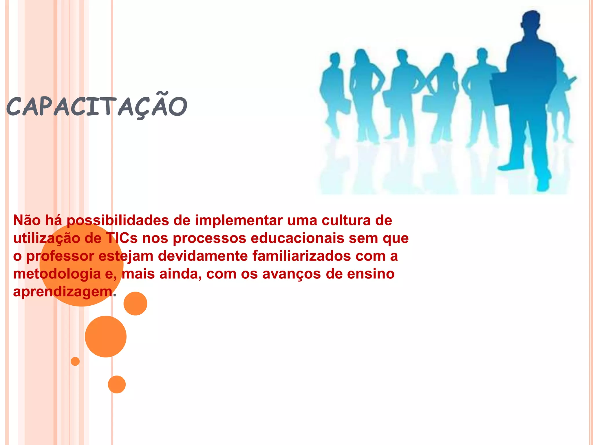 O documento discute a capacitação de professores no uso de TICs, descrevendo um curso de 180 horas dividido em 3 módulos para familiarizar os professores com ferramentas digitais e integrá-las no ensino. Também menciona o Portal do Professor, que fornece recursos educacionais digitais para apoiar a prática docente.