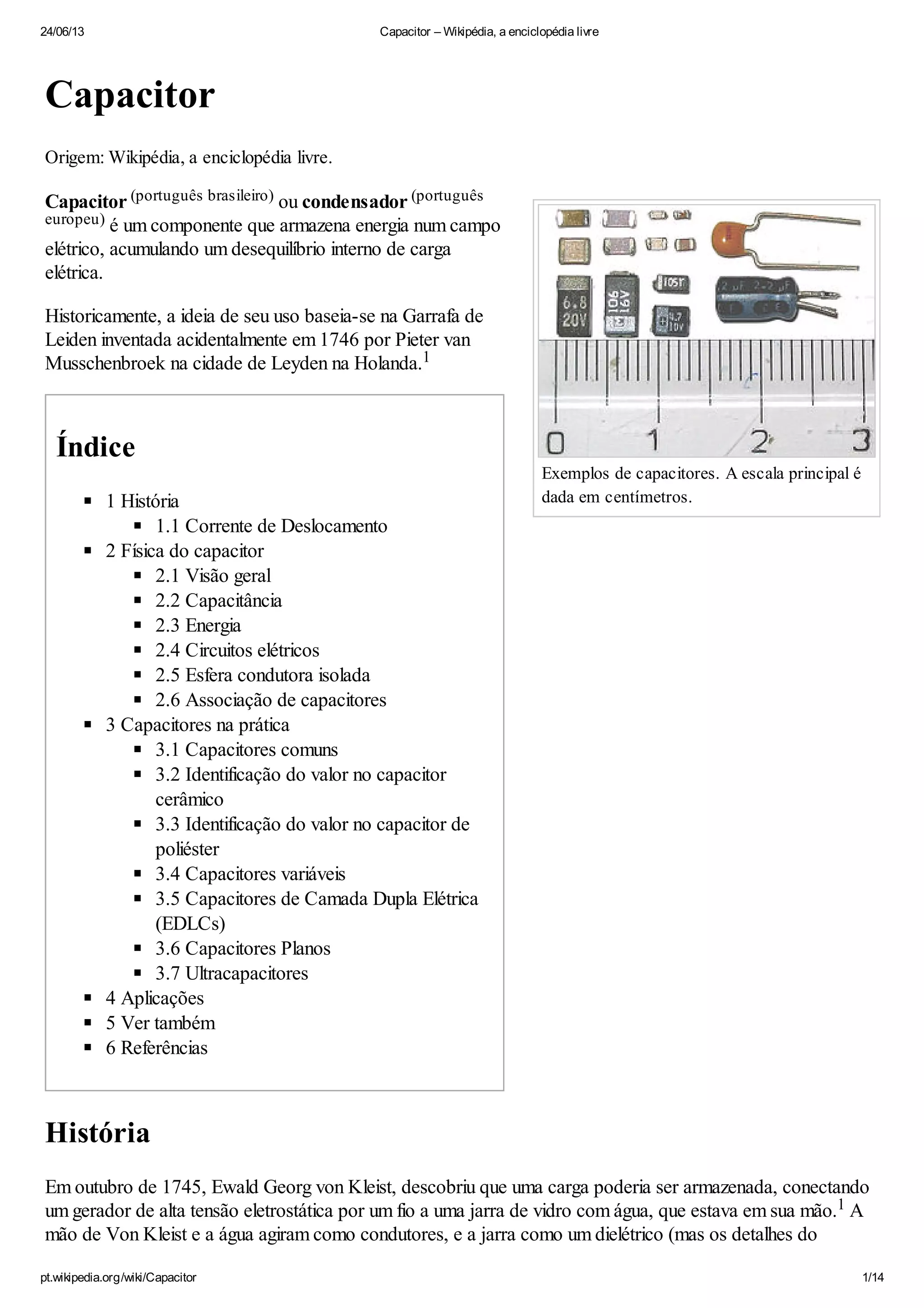 O documento descreve o capacitor, um componente elétrico que armazena energia em um campo elétrico. Brevemente discute a história do capacitor desde sua invenção acidental em 1746, e como ele funciona armazenando cargas elétricas opostas em placas separadas por um material isolante. Também resume os principais tipos de capacitores e suas aplicações em circuitos elétricos.