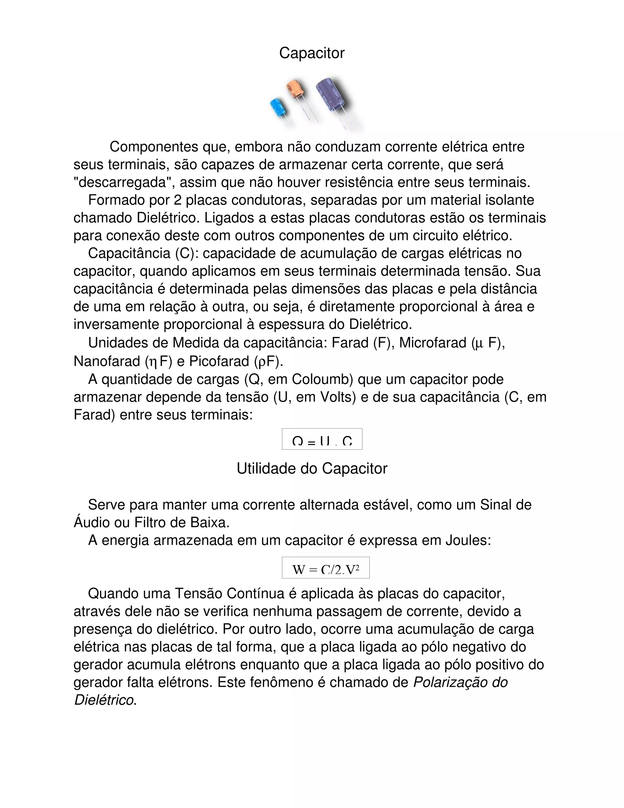 1) Capacitores armazenam carga elétrica entre duas placas condutoras separadas por um material isolante. 2) A capacitância de um capacitor depende do tamanho e distância entre as placas e da constante dielétrica do material isolante. 3) Capacitores são usados para estabilizar correntes alternadas e filtrar sinais de áudio.