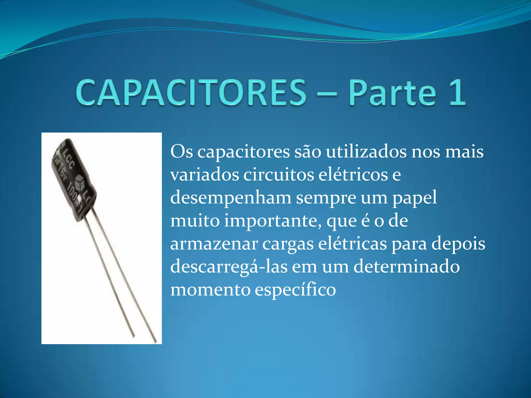 O documento descreve os capacitores, dispositivos elétricos que armazenam carga e podem descarregá-la rapidamente. Explica que capacitores são usados em circuitos e dispositivos como flashes de câmeras para armazenar energia e descarregá-la quase instantaneamente. Detalha também como a capacitância de um capacitor é medida e os componentes básicos de um capacitor plano.