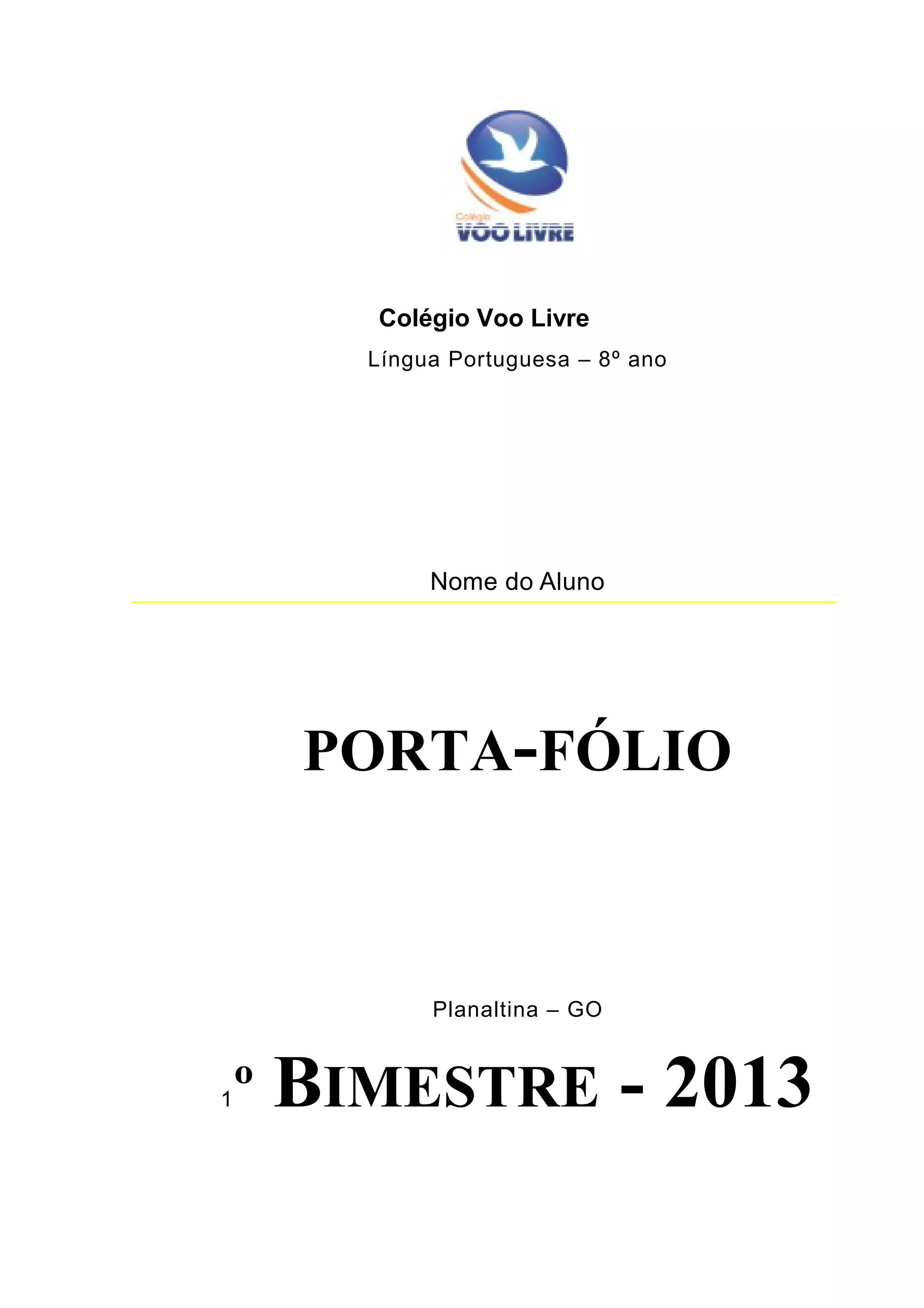 Este documento é um portfólio de um aluno do 8o ano do Colégio Voo Livre em Planaltina-GO para o 1o bimestre de 2013.