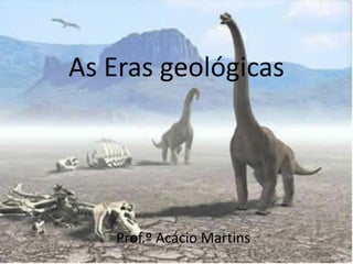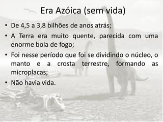 O documento resume as principais eras geológicas da Terra, incluindo a Era Azóica sem vida, o Período Pré-Cambriano com o início da vida primitiva, a Era Paleozoica com o grande desenvolvimento da vida antiga, a Era Mesozoica com o desenvolvimento de répteis e dinossauros, e a Era Cenozoica com o desaparecimento dos dinossauros e o surgimento dos seres humanos.
