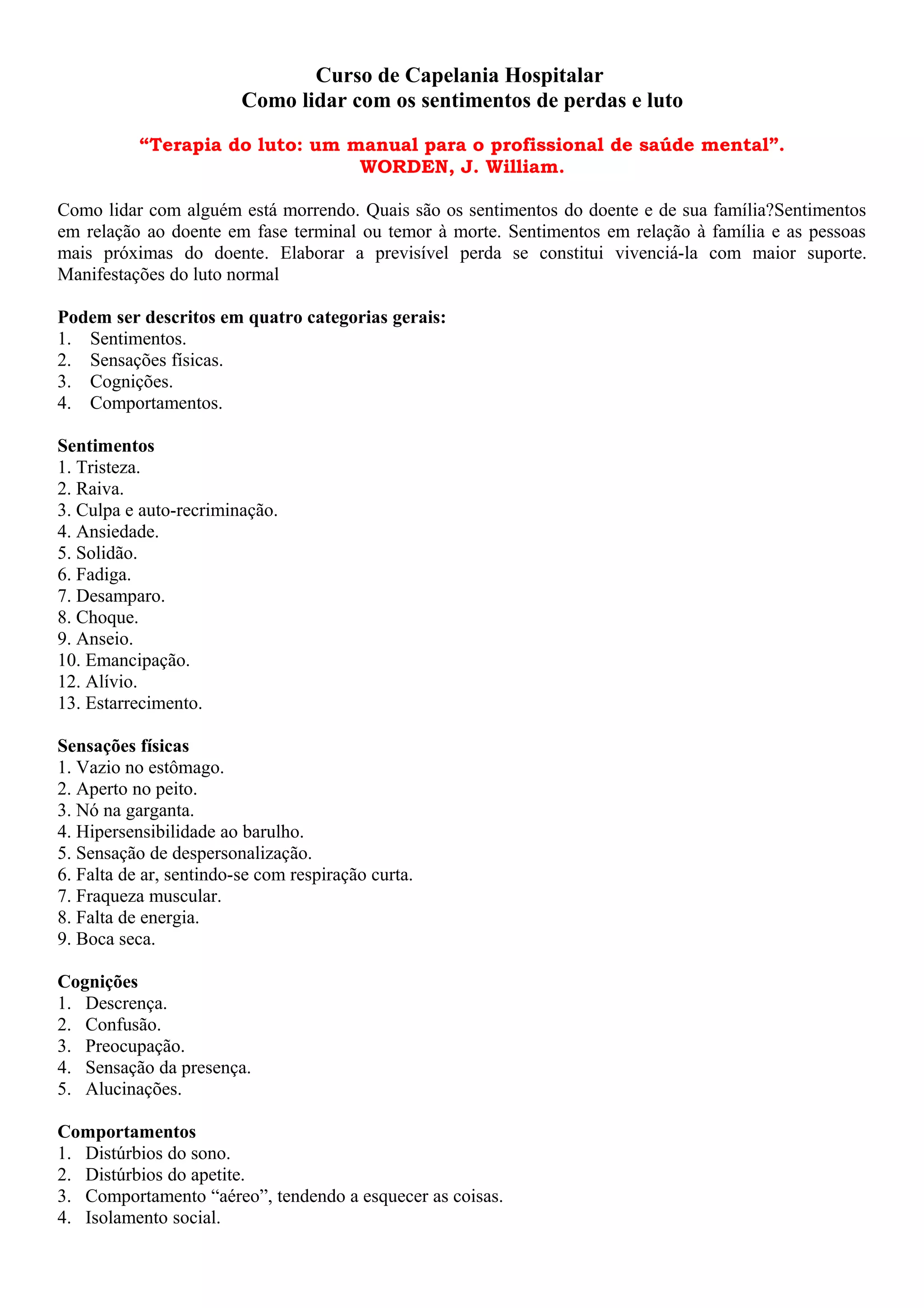 O documento discute os sentimentos e reações associados ao luto e à perda, incluindo tristeza, raiva, culpa e ansiedade. Ele também descreve as fases do luto e princípios para o aconselhamento de luto, como ajudar a pessoa a reconhecer a perda, expressar sentimentos e se reposicionar emocionalmente em relação à pessoa falecida.