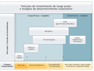 O documento discute diferentes tipos de investidores de capital, incluindo empreendedores pioneiros no Brasil, o magnata da mídia Chatô, e os papéis de capitalista empreendedor, venture capital e private equity. Também fornece exemplos de empresas de capital de risco bem-sucedidas e suas estratégias de investimento.