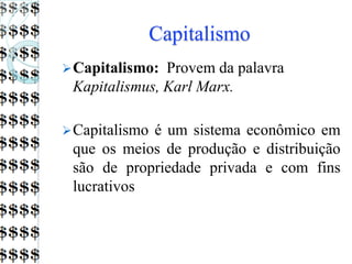 O documento discute o capitalismo, definindo-o como um sistema econômico onde os meios de produção e distribuição são propriedade privada com fins lucrativos. Explora as origens do capitalismo na transição da Idade Média para a Idade Moderna e as características do sistema capitalista, como produção para venda e lucro em vez de uso pessoal. Também descreve os diferentes tipos de capitalismo ao longo da história: comercial, industrial e financeiro.