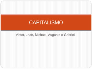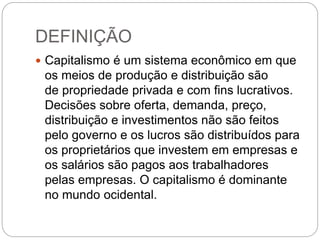 O documento define capitalismo como um sistema econômico em que os meios de produção são propriedade privada e visam lucro. Relata que o capitalismo teve início na Europa medieval com a transferência do centro econômico para as cidades, e que se estabeleceu como sistema dominante após revoluções liberais nos séculos XVIII-XIX. Descreve também as fases do capitalismo: comercial, industrial e monopolista-financeiro.
