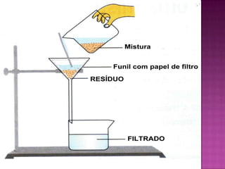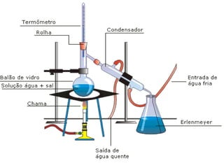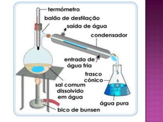 O documento discute vários métodos de separação de misturas, incluindo filtração, decantação, centrifugação, destilação e cristalização fracionada. Também aborda equipamentos de laboratório como bicos de Bunsen, tubos de ensaio e balões de Erlenmeyer, além de medidas de segurança em laboratórios de química.