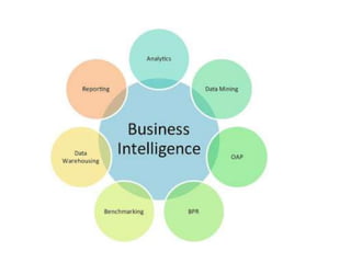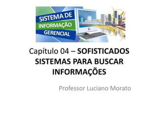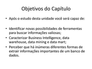 O documento discute sistemas sofisticados para buscar informações, incluindo Business Intelligence, data warehouse, data mining e data mart. Business Intelligence integra ferramentas analíticas para melhorar a tomada de decisão. Data warehouse armazena dados históricos de toda a empresa para análise. Data mining usa inteligência artificial para encontrar padrões nos dados armazenados. Data marts focam em informações específicas para unidades de negócios.