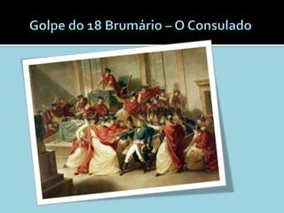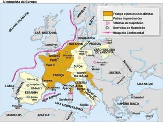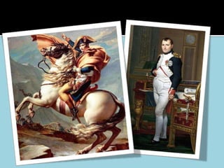 Napoleão Bonaparte nasceu na Córsega em 1769 e tornou-se um líder militar e político durante a Revolução Francesa. Ele conquistou grande parte da Europa através de vitórias militares, mas acabou sendo derrotado e exilado em 1815. Sua ascensão e queda teve grandes impactos na Europa e na América Latina na época.