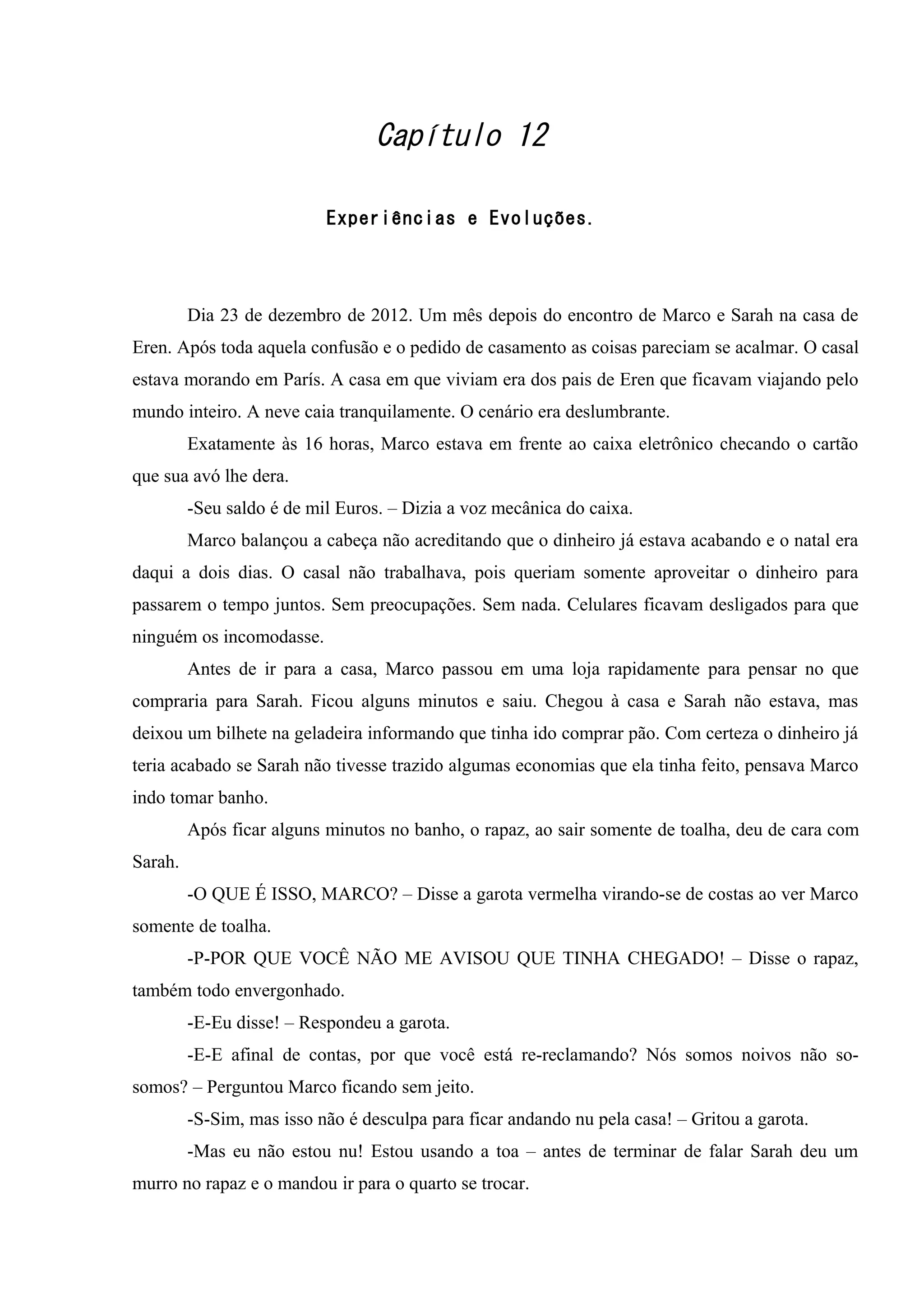 O documento descreve o Natal de Marco e Sarah em Paris após fugirem de casa. Seu dinheiro está acabando e eles decidem voltar, com a condição de terminarem a faculdade. Marco propõe voltar com Sarah para apoiá-la. Na véspera de Natal, ele dá um anel de noivado para ela.
