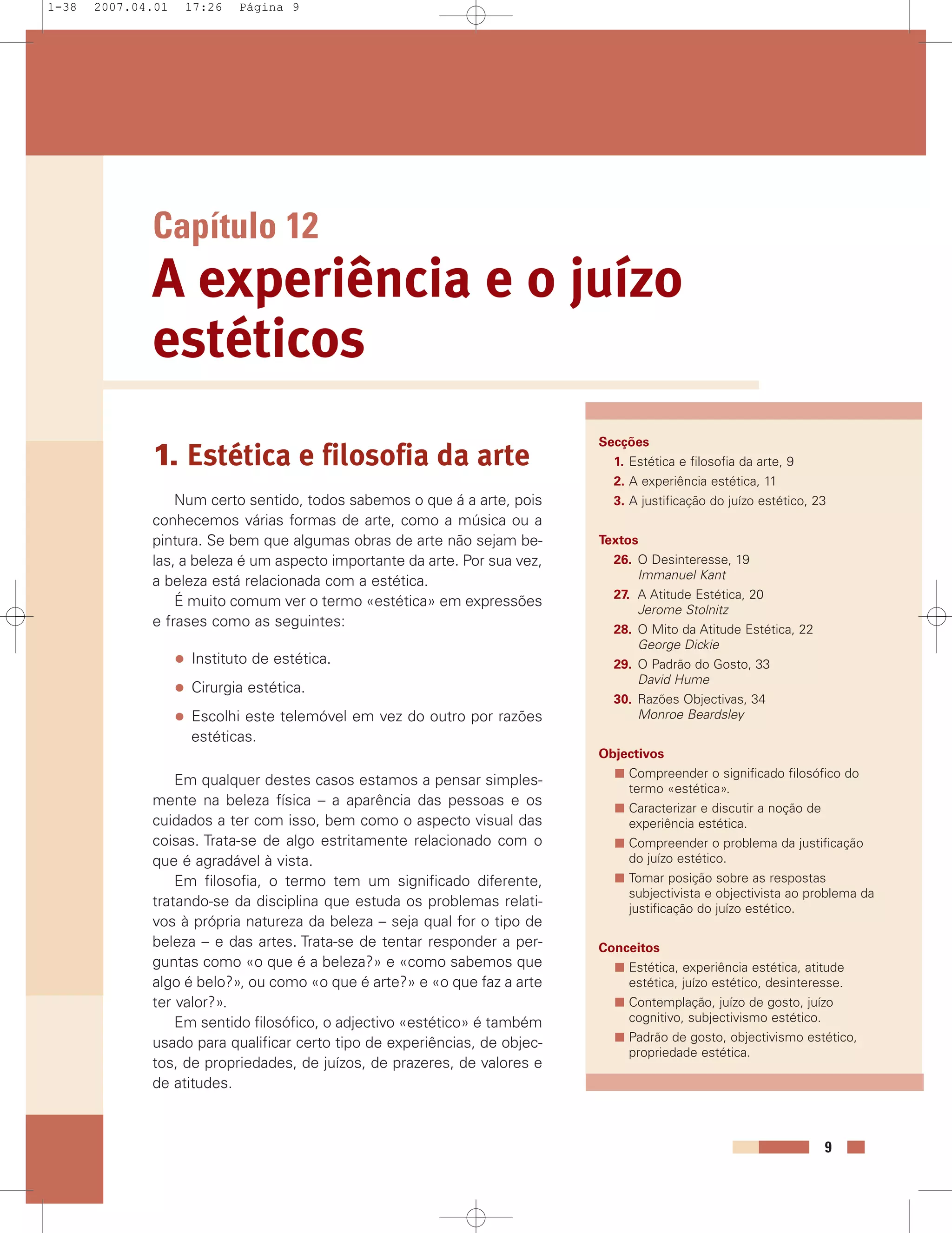 1. O documento discute a experiência estética e o juízo estético na filosofia. 2. Aborda a distinção proposta por Kant entre experiência estética e não estética, definindo a experiência estética como um sentimento de prazer desinteressado. 3. Explora como Kant diferencia juízos estéticos de juízos cognitivos, argumentando que os juízos estéticos referem-se a um estado subjectivo de prazer em vez do conhecimento objetivo.